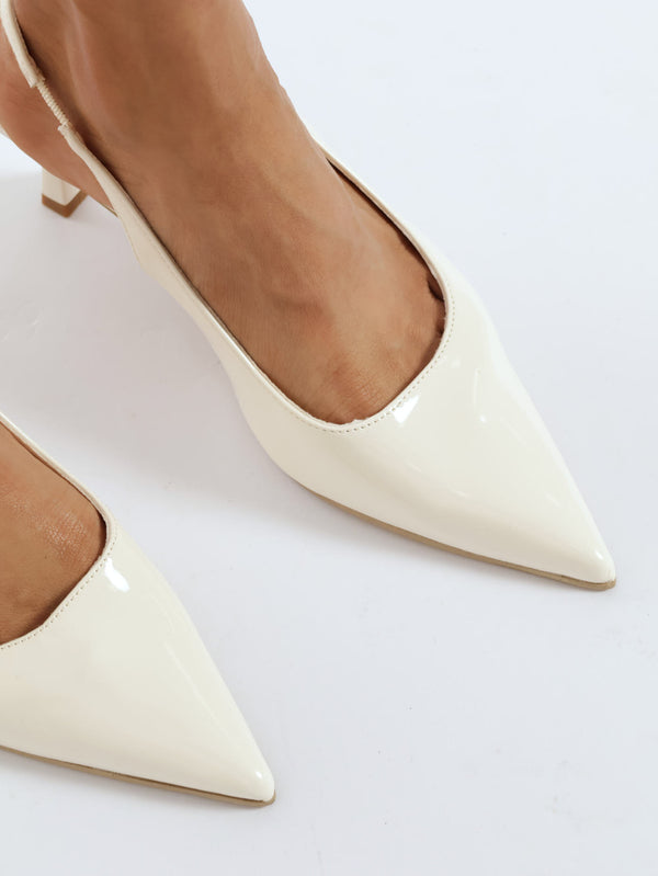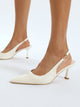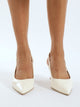 Step into playful elegance with the Link Trim Pointy Slingback Court Heel in Off White. Featuring a chic pointed toe and eye-catching chain link trim, these heels add a fun twist to classic sophistication—perfect for elevating any outfit with a splash of flair!