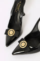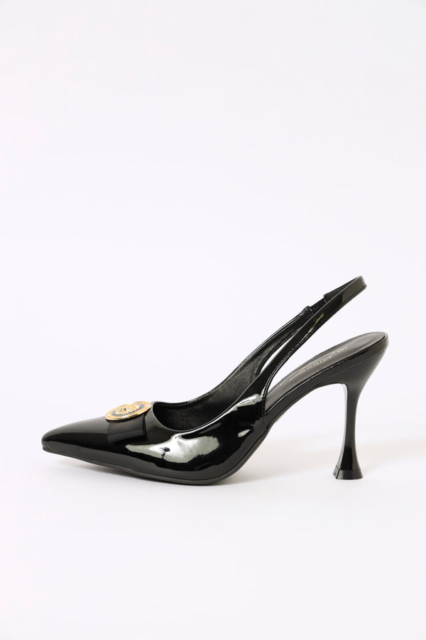 Elevate your ensemble with these sophisticated black court heels. Featuring an elegant hi-shaped silhouette, pointed toe, and distinctive bow trim, these slingback pumps blend timeless style with contemporary flair. The sleek design transitions effortlessly from professional settings to evening occasions, offering both refinement and versatility for the discerning woman.