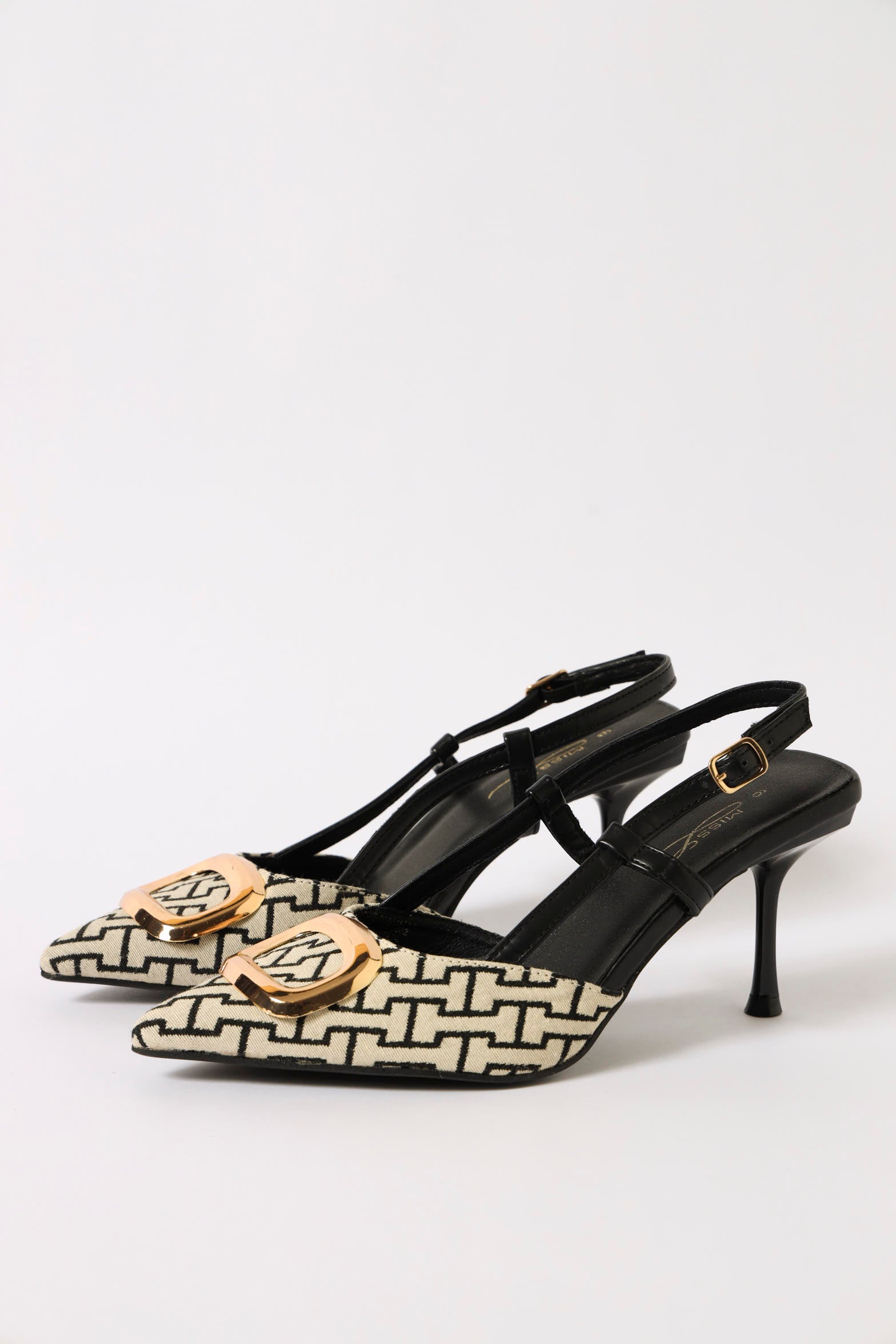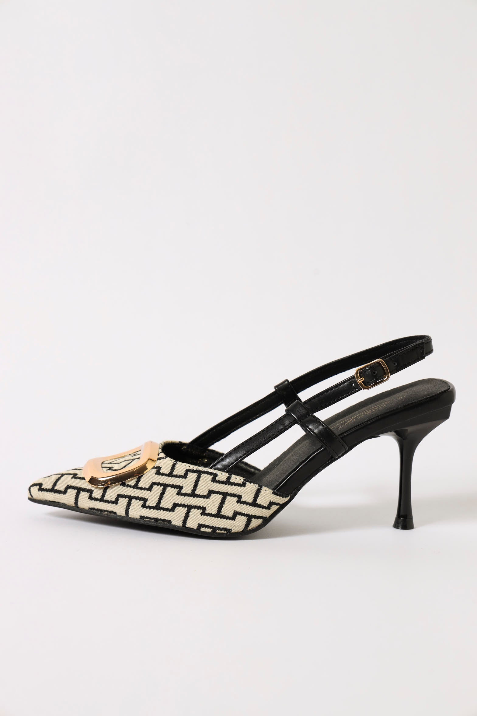 Elevate your shoe game with our Mid Slingback Pointy Monogram Court Heel in sleek black. The pointed toe adds instant sophistication, while the slingback design keeps things secure and comfy all day long. Topped with a chic monogram detail, these heels are your secret weapon for looking polished without trying too hard. Perfect for the office, date night, or anywhere you want to make a statement. Go ahead, strut your stuff!