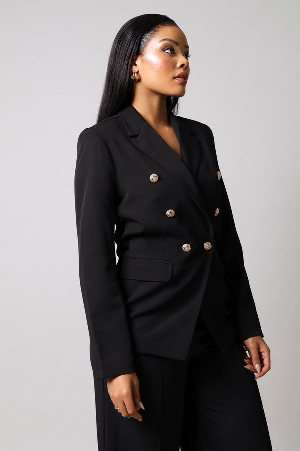Make a bold statement with this jet black double-breasted blazer that screams confidence and sophistication. The classic long sleeves and structured silhouette deliver that power-dressing energy you've been craving, whether you're conquering the boardroom or turning heads at an evening event. This timeless piece is your secret weapon for instantly leveling up any outfit—throw it over a dress, pair it with tailored trousers, or rock it solo for maximum impact. Because sometimes the best accessory is an attitude, and this blazer's got plenty to spare.