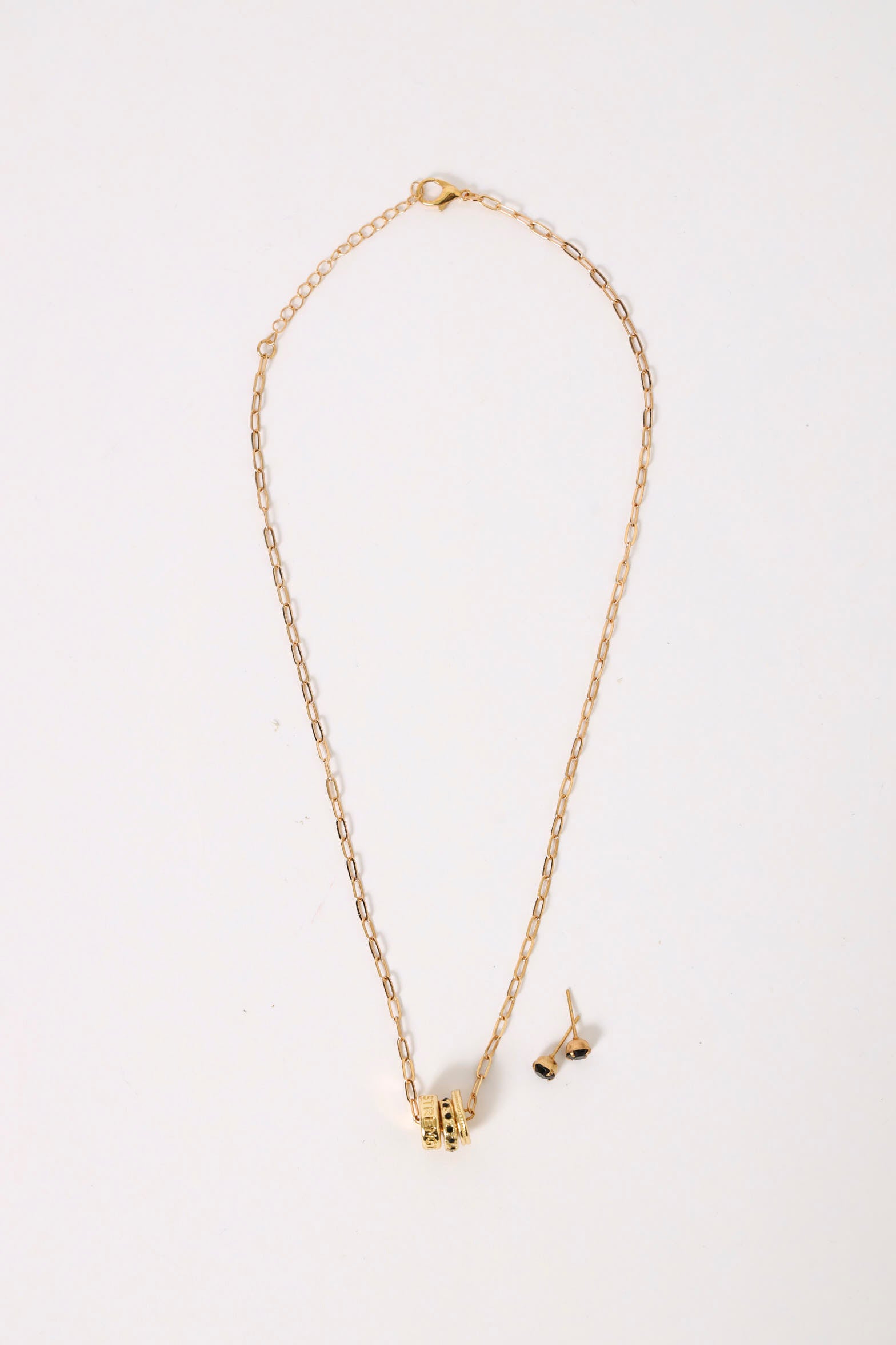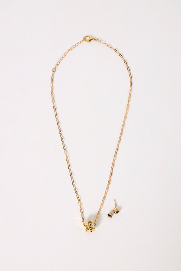 3 Set Epoxy & Diamante Pendant Necklace And Diamante Stud Earrings - Black/Gold