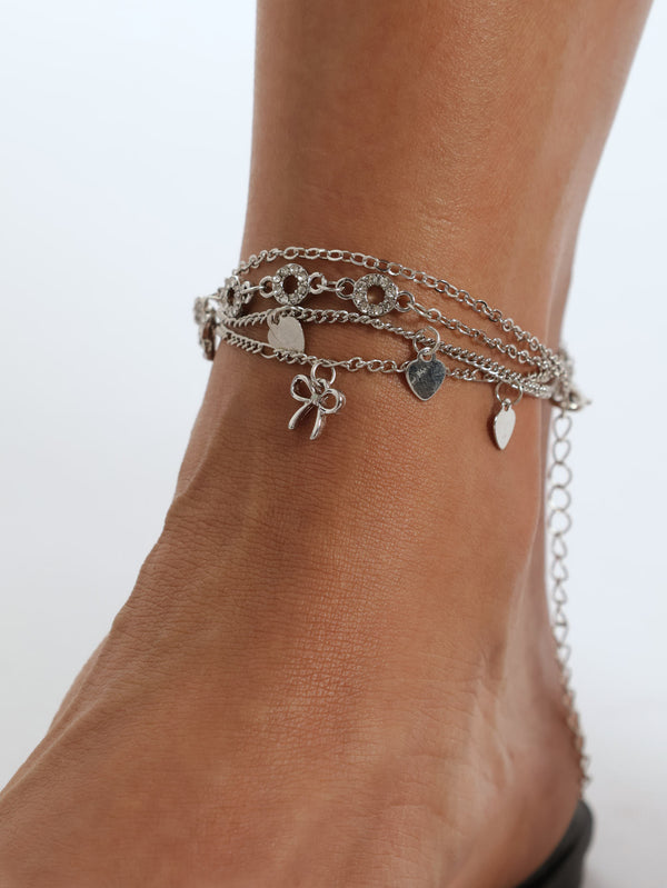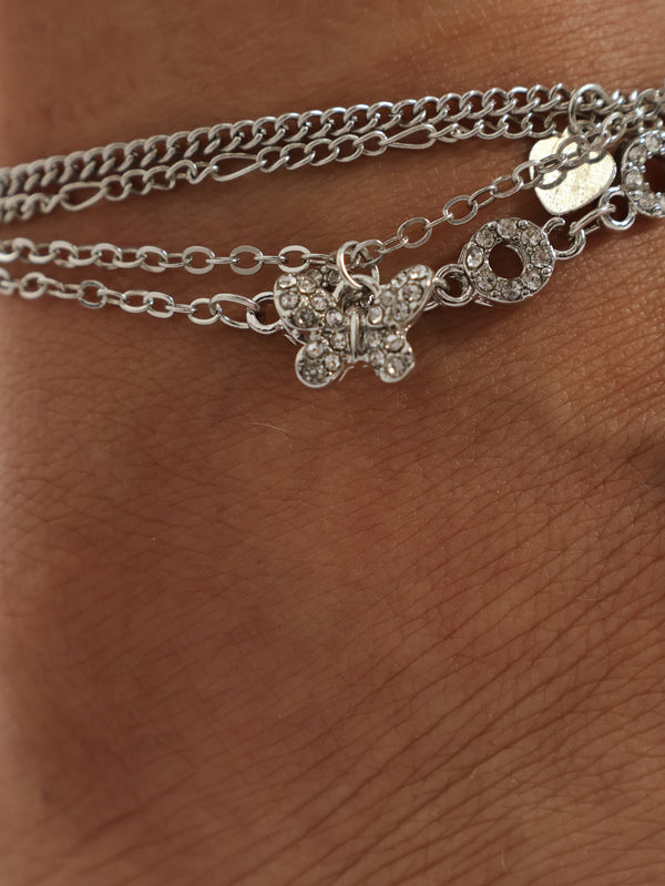 4 Diamante Bow & Butterfly Charm Anklets - Silver