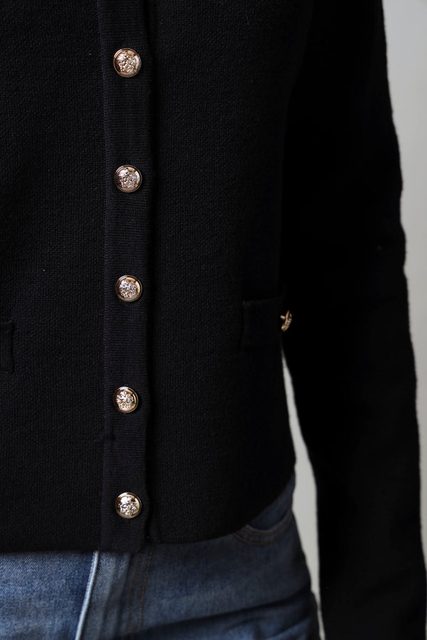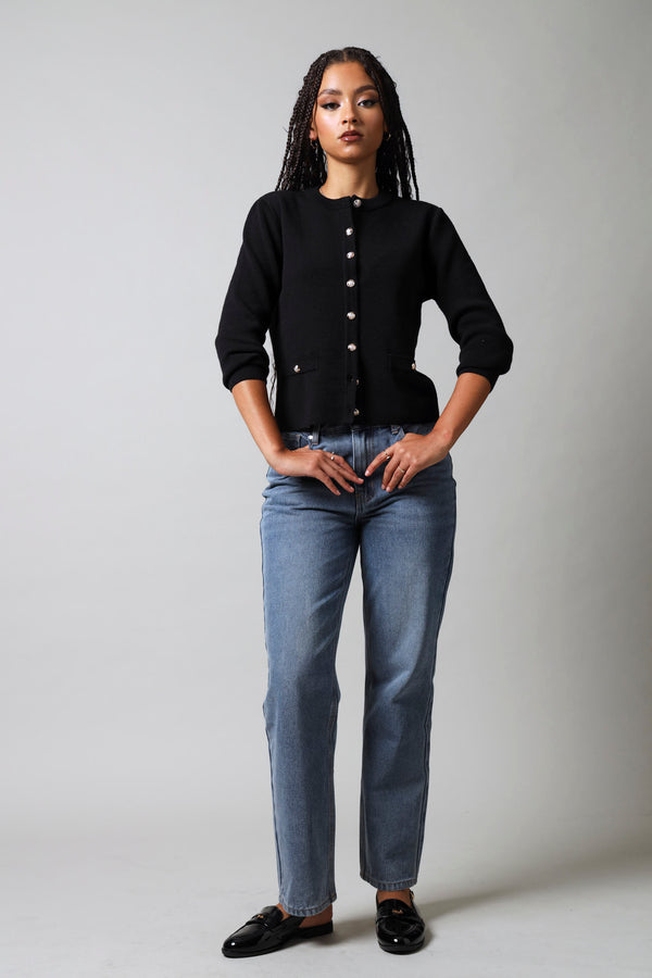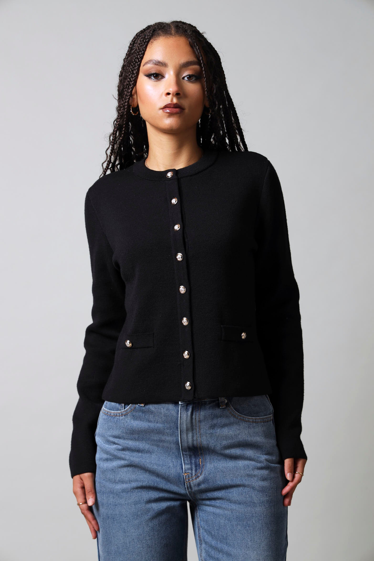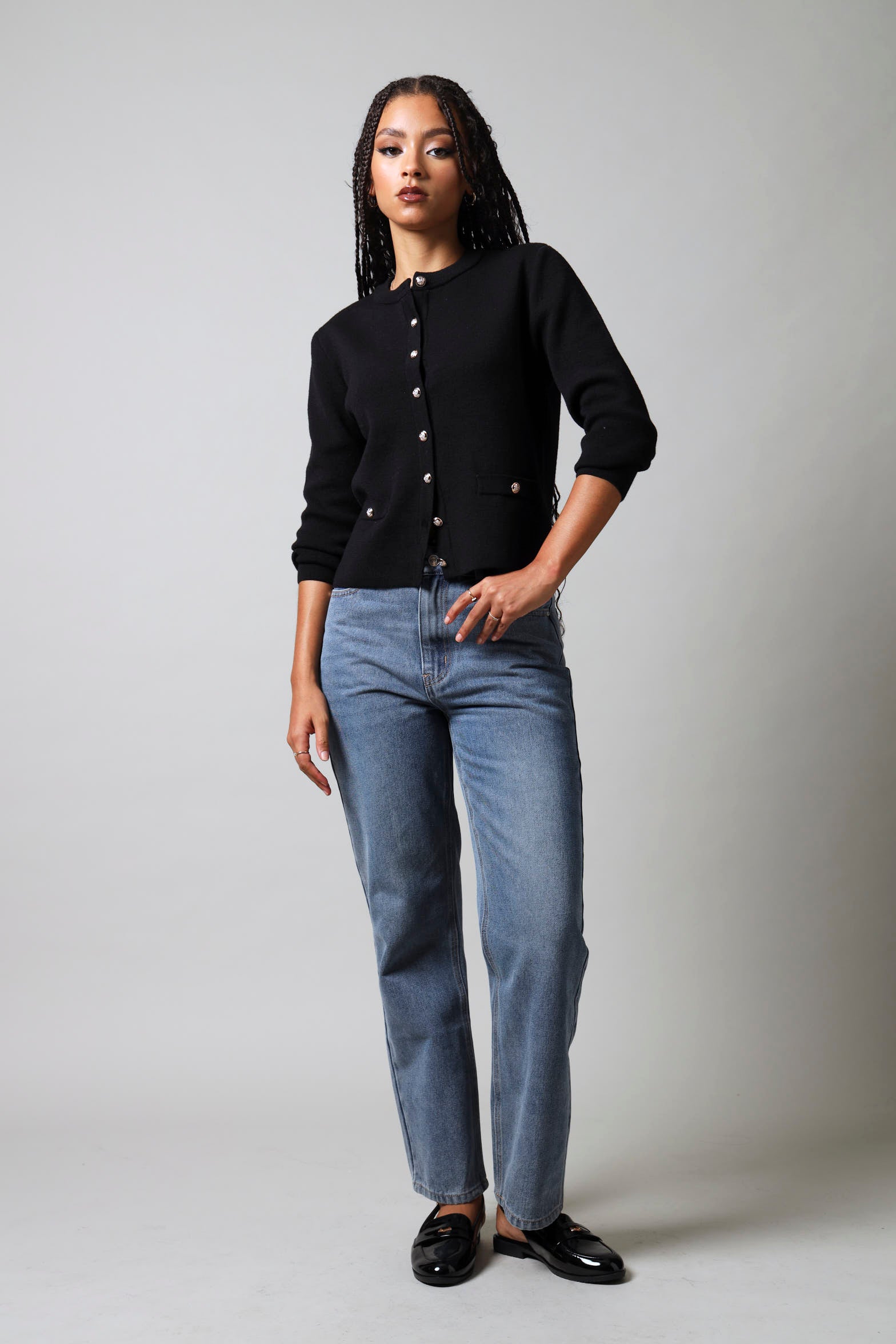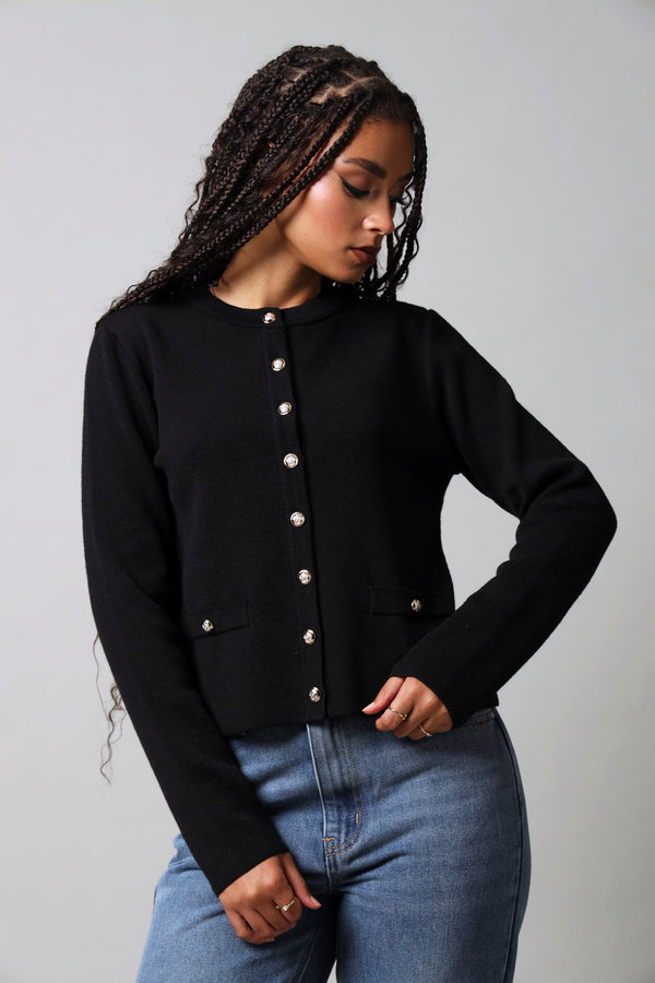 Elevate your style with our luxurious Fancy Button Cardigan in classic black. The intricate, fancy buttons add a touch of elegance to this high-quality, versatile piece. Perfect for any occasion, this cardigan will elevate your wardrobe and keep you cozy in style.