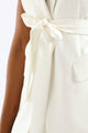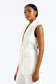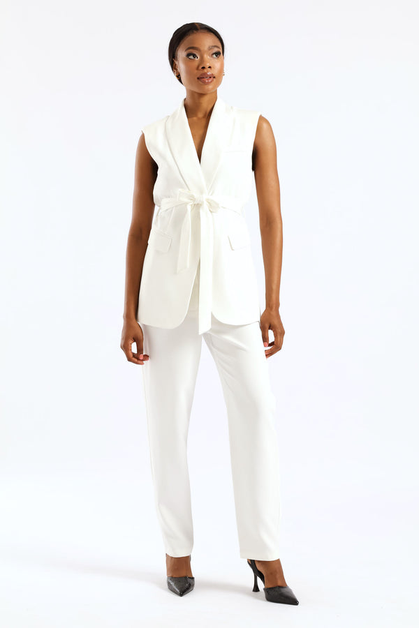 Elevate your look with the Sleeveless Tie Waist Blazer in crisp white. Its playful tie waist adds a flirty shape, while the sleeveless design keeps things cool and fresh. Perfect for mixing business with a splash of fun, this blazer brings a cheeky edge to any outfit.