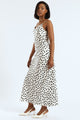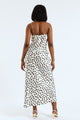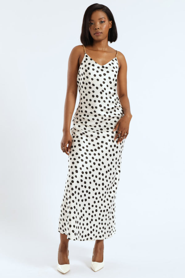 This Chain Strap Printed Satin Slip Dress in White and Black exudes effortless elegance with its smooth satin finish and delicate chain straps. The sophisticated print adds a subtle statement, while the sleek silhouette enhances your natural grace. Ideal for evening occasions, it combines comfort and style with refined charm.