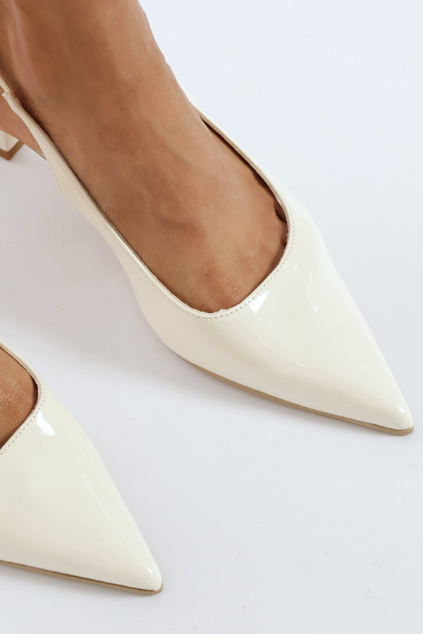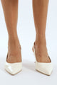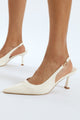 Step into playful elegance with the Link Trim Pointy Slingback Court Heel in Off White. Featuring a chic pointed toe and eye-catching chain link trim, these heels add a fun twist to classic sophistication—perfect for elevating any outfit with a splash of flair!