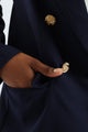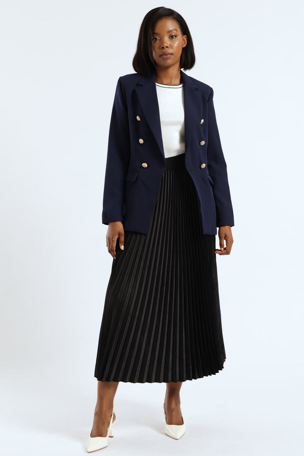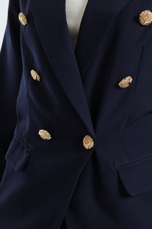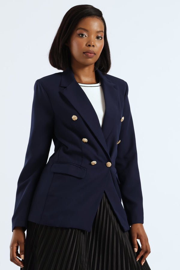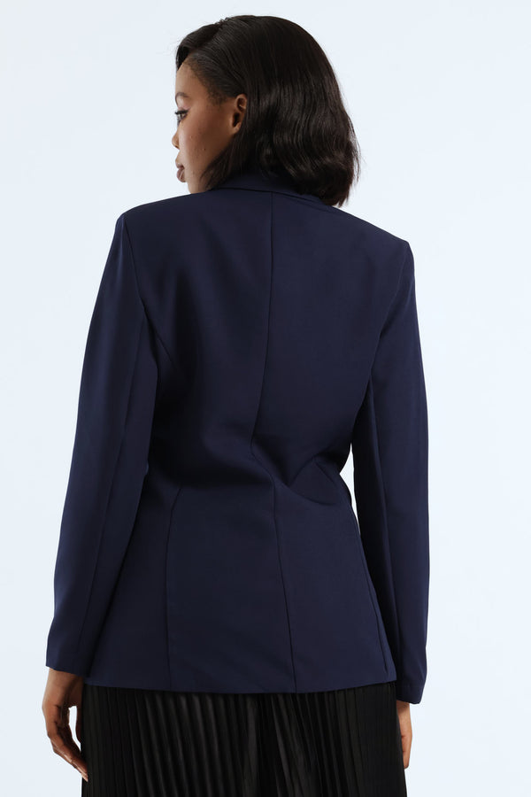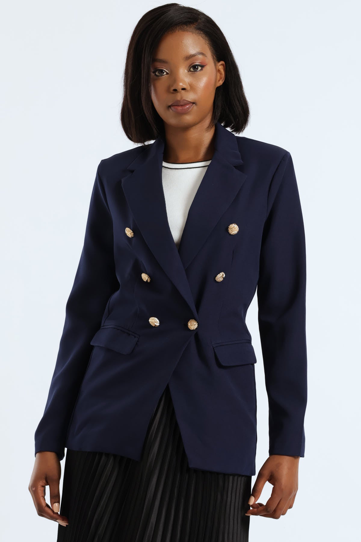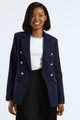 Long Sleeve Double Breasted Metal Button Blazer - Navy