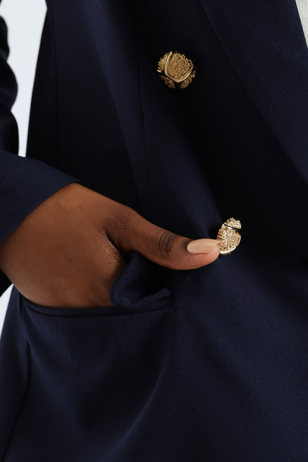 Elevate your look with a twist of fun in the Long Sleeve Double Breasted Metal Button Blazer in Navy. Classic meets cheeky with shiny metal buttons and a sleek double-breasted design that’s perfect for making a stylish statement—whether at work or out on the town.