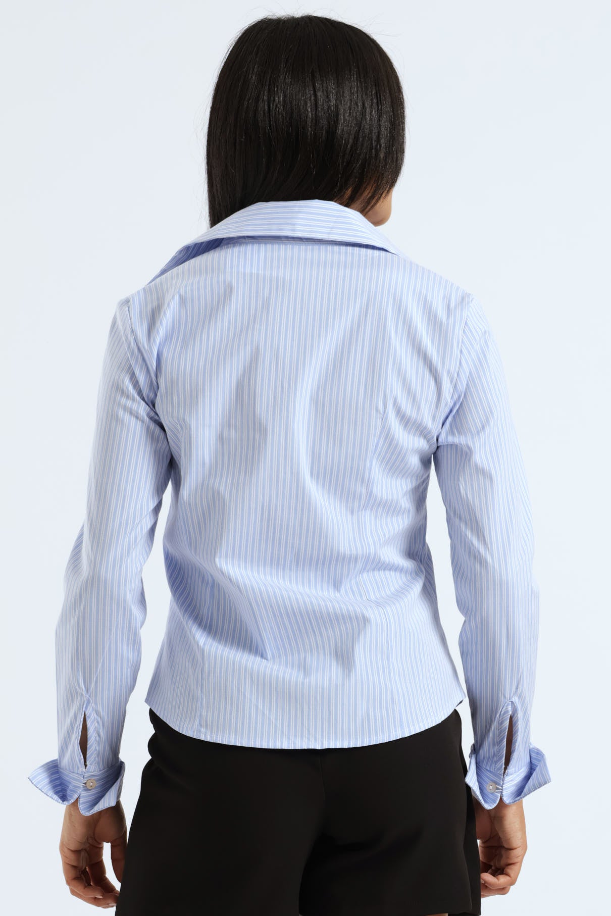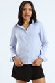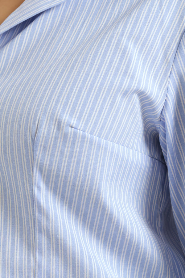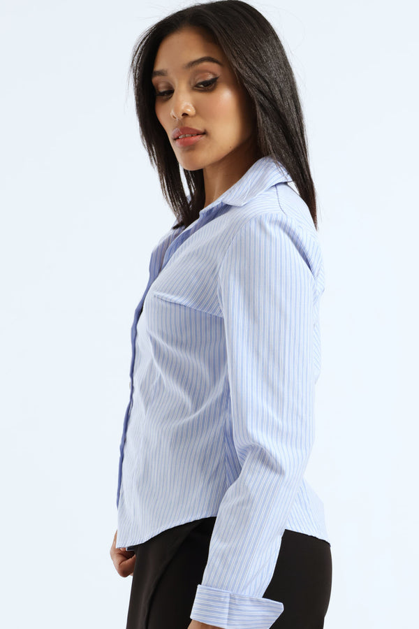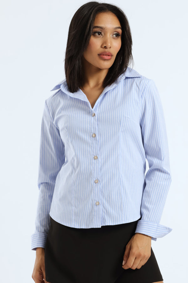 The Long Sleeve Fitted Stripe Poplin Shirt in white and blue offers a crisp, tailored look perfect for refined wardrobes. Crafted from lightweight poplin fabric, it features subtle stripes that enhance its sleek silhouette. This shirt combines timeless elegance with a flattering fit, ideal for polished office wear or sophisticated casual styling.