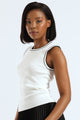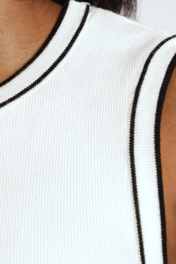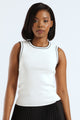 This Sleeveless Tipping Detail Tank Top in White and Black combines minimalist design with refined accents. The subtle tipping detail adds a polished edge to the clean silhouette, making it a versatile piece for layering or wearing solo. Its tailored fit offers understated sophistication for both casual and elevated looks.