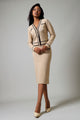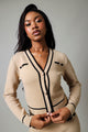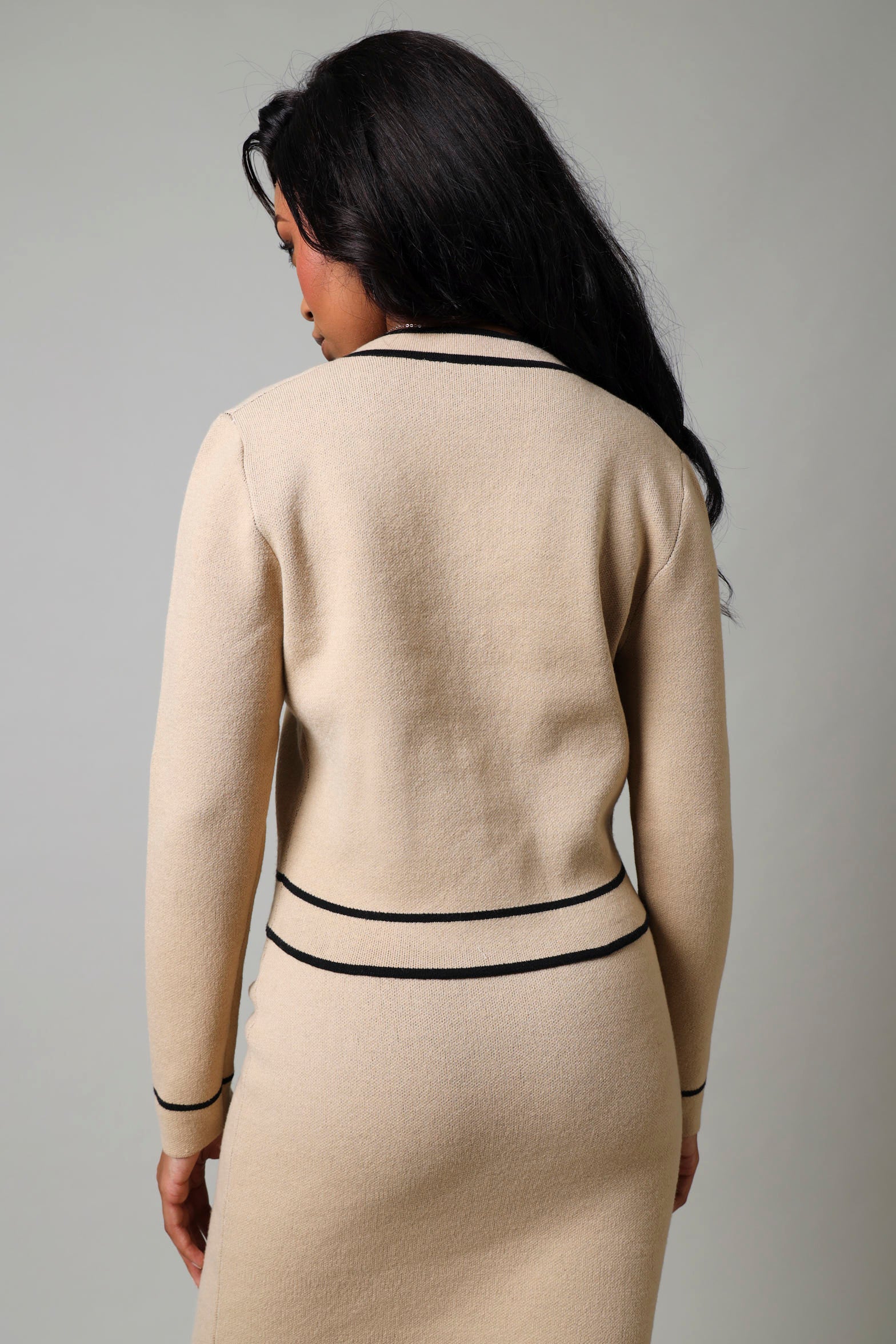 Complete your coordinated look with this sophisticated long sleeve cardigan, designed as part of a curated matching set. The elegant beige and black contrast tipping creates a refined aesthetic that pairs seamlessly with complementary pieces. Layer it over coordinating items for a polished, put-together ensemble that exudes understated luxury. Perfect for those who appreciate cohesive styling and timeless sophistication.