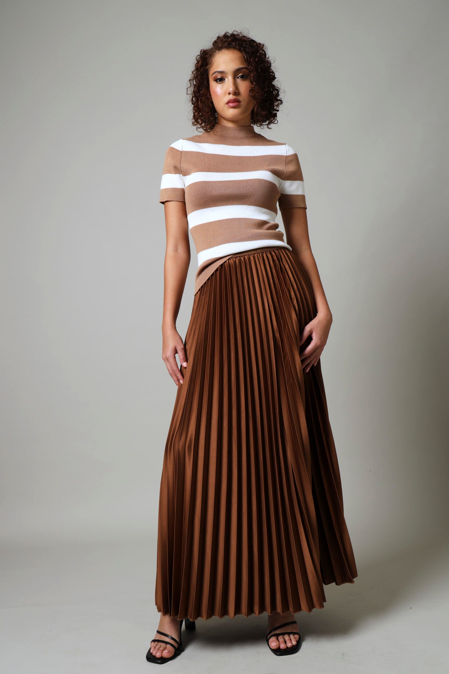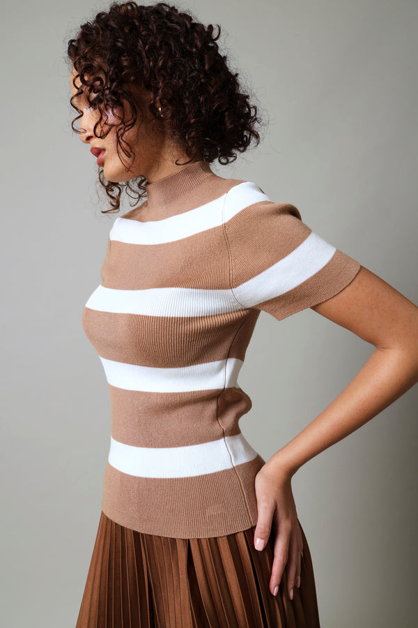 Stripes never go out of style and this breezy knitwear top proves it. Crafted in soft, breathable fabric with a charming beige and white stripe pattern, it's the perfect piece for effortless layering or standalone wear. Short sleeves keep things cool and casual, while the relaxed fit ensures all-day comfort. Whether you're heading to brunch or running errands, this timeless striped essential pairs with everything in your wardrobe.