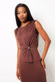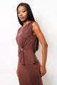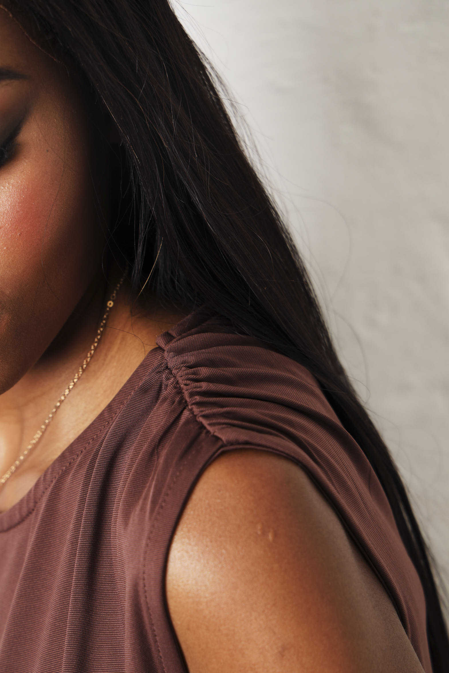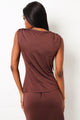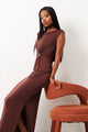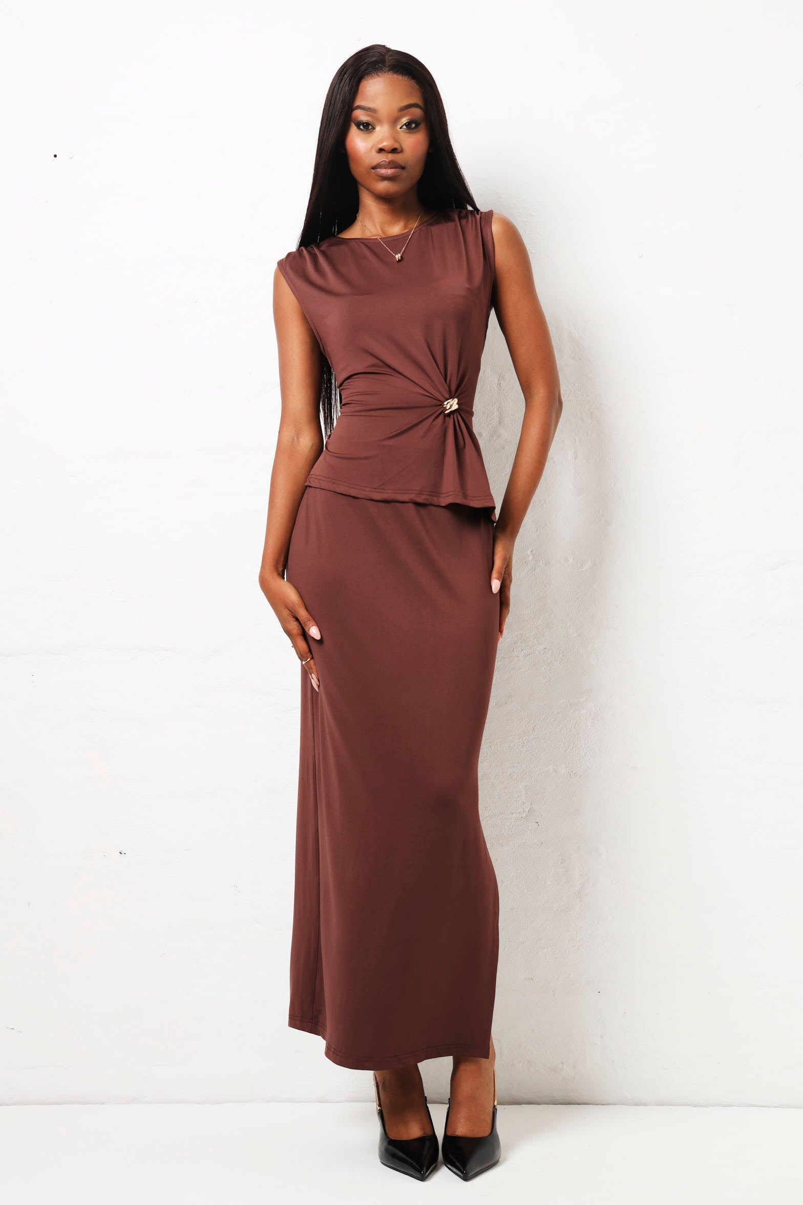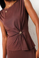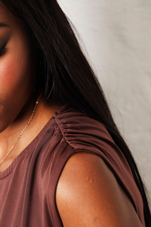 This sleeveless slinky top in warm brown showcases elegant trim accents that define its refined aesthetic. Crafted from luxurious draping fabric, it offers a graceful silhouette suitable for both casual and formal occasions. As part of a curated set, it coordinates perfectly with matching pieces to create a cohesive, polished ensemble that exudes understated sophistication.