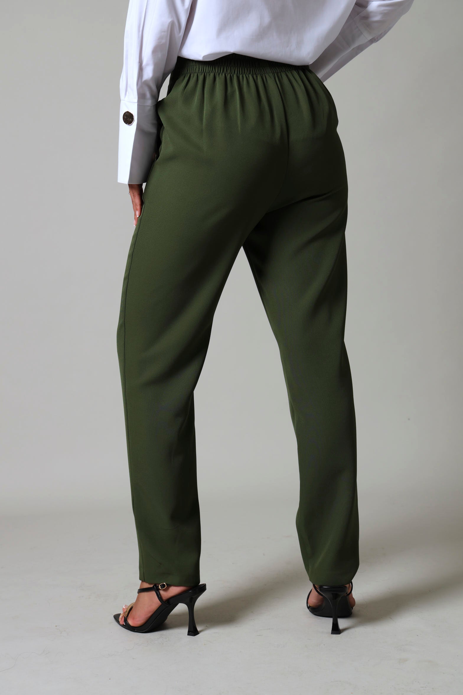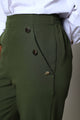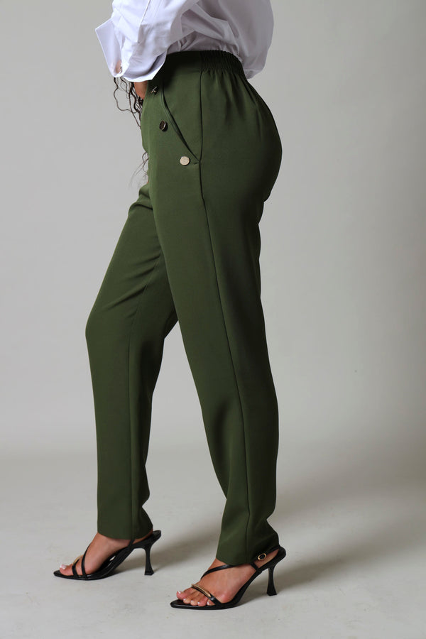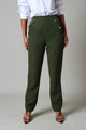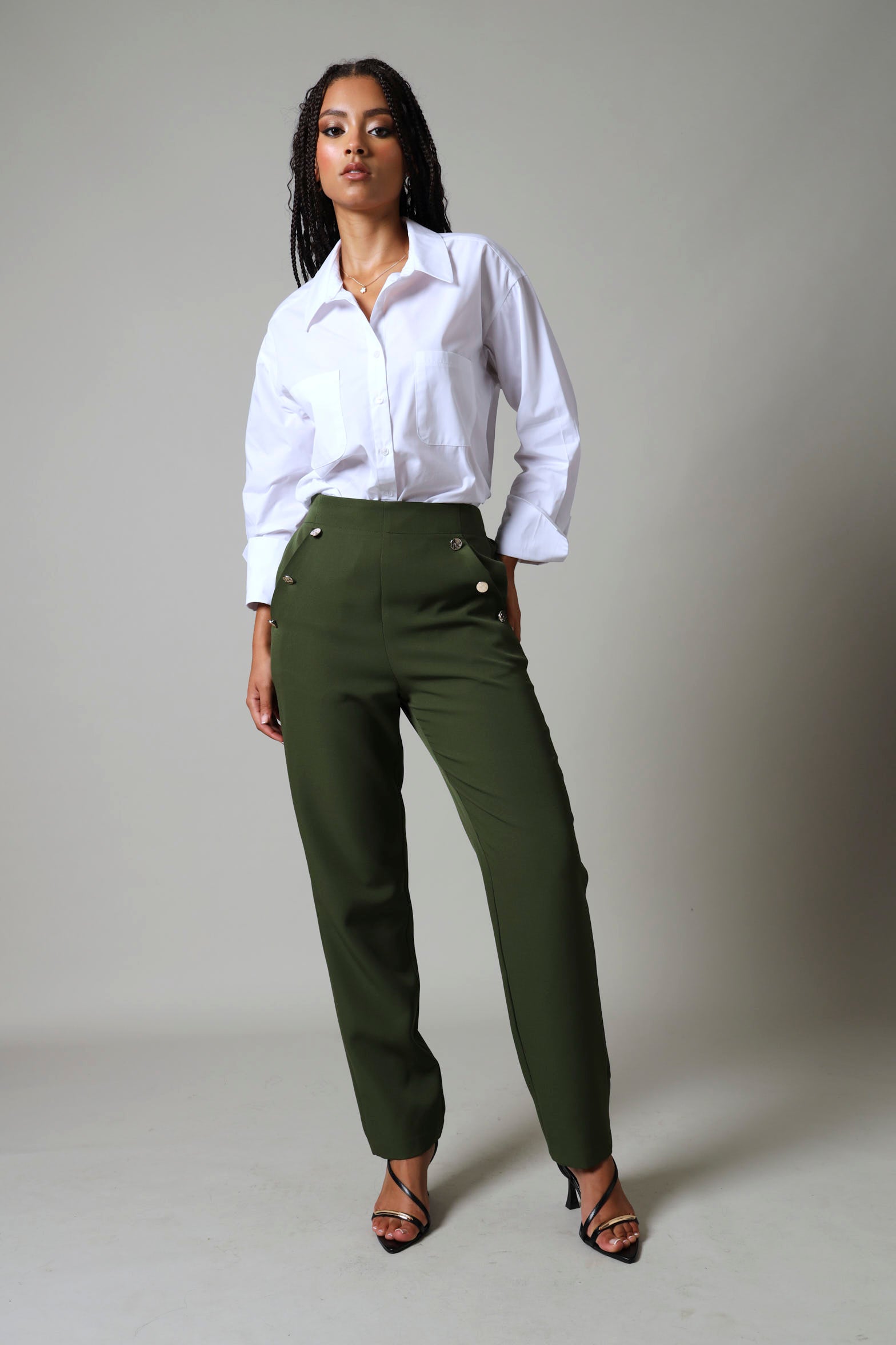 Discover understated luxury with these slim leg pants in a timeless fatigue shade. The streamlined cut provides a modern silhouette that pairs effortlessly with any ensemble, while ornamental buttons elevate the design with refined detailing. Crafted for the discerning individual who appreciates quality and subtlety, these trousers transition seamlessly from professional settings to sophisticated casual occasions. A wardrobe essential that speaks to impeccable taste.
