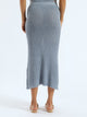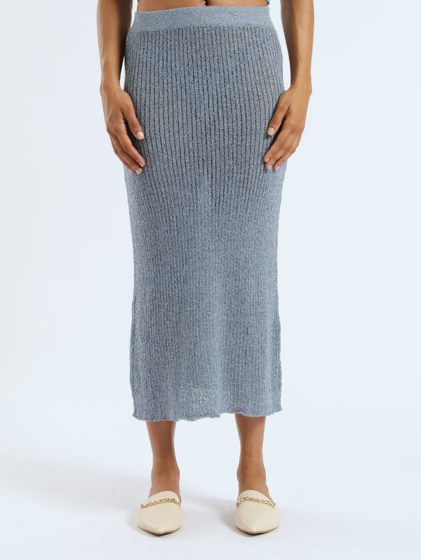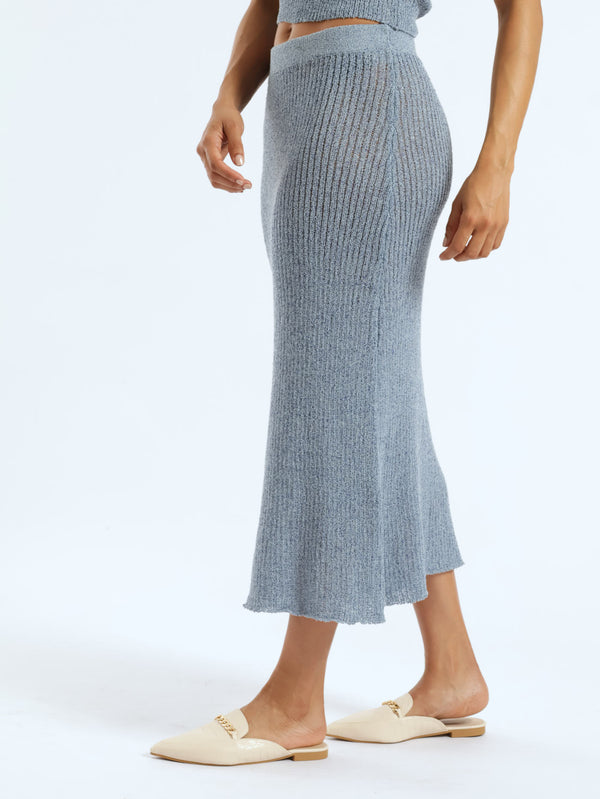 Elevate your wardrobe with the Melange Knitwear Flare Midi Skirt in Blue. Crafted from soft, comfortable knitwear, this skirt offers a flattering flare silhouette that gracefully enhances your figure. Its midi length adds an elegant touch, making it versatile for both professional settings and refined casual occasions. The subtle melange texture enriches the design with understated sophistication, perfect for a polished, modern look.