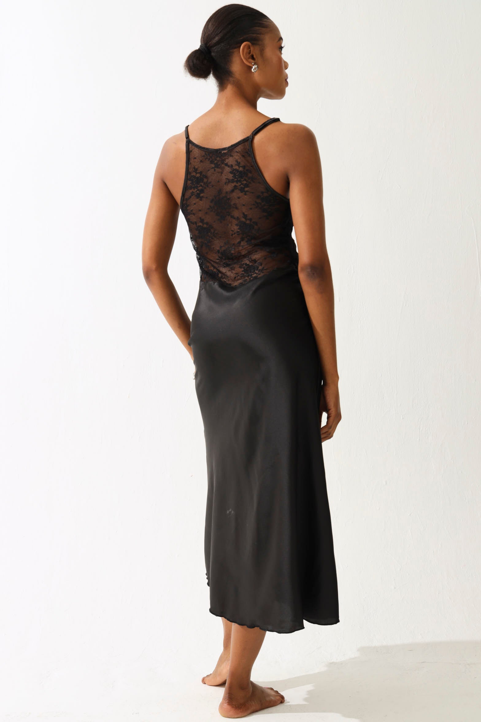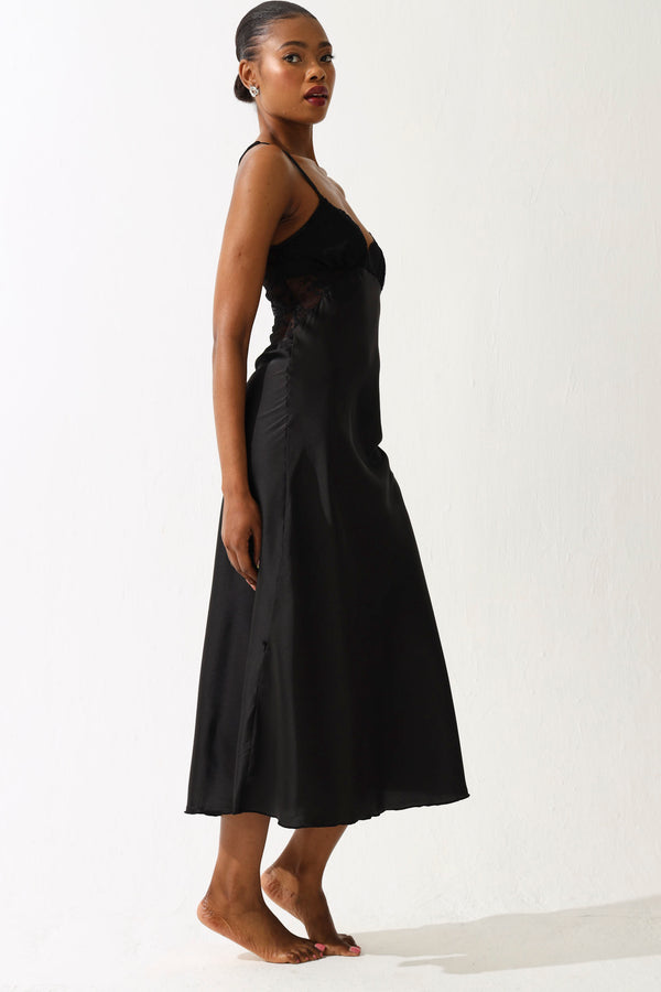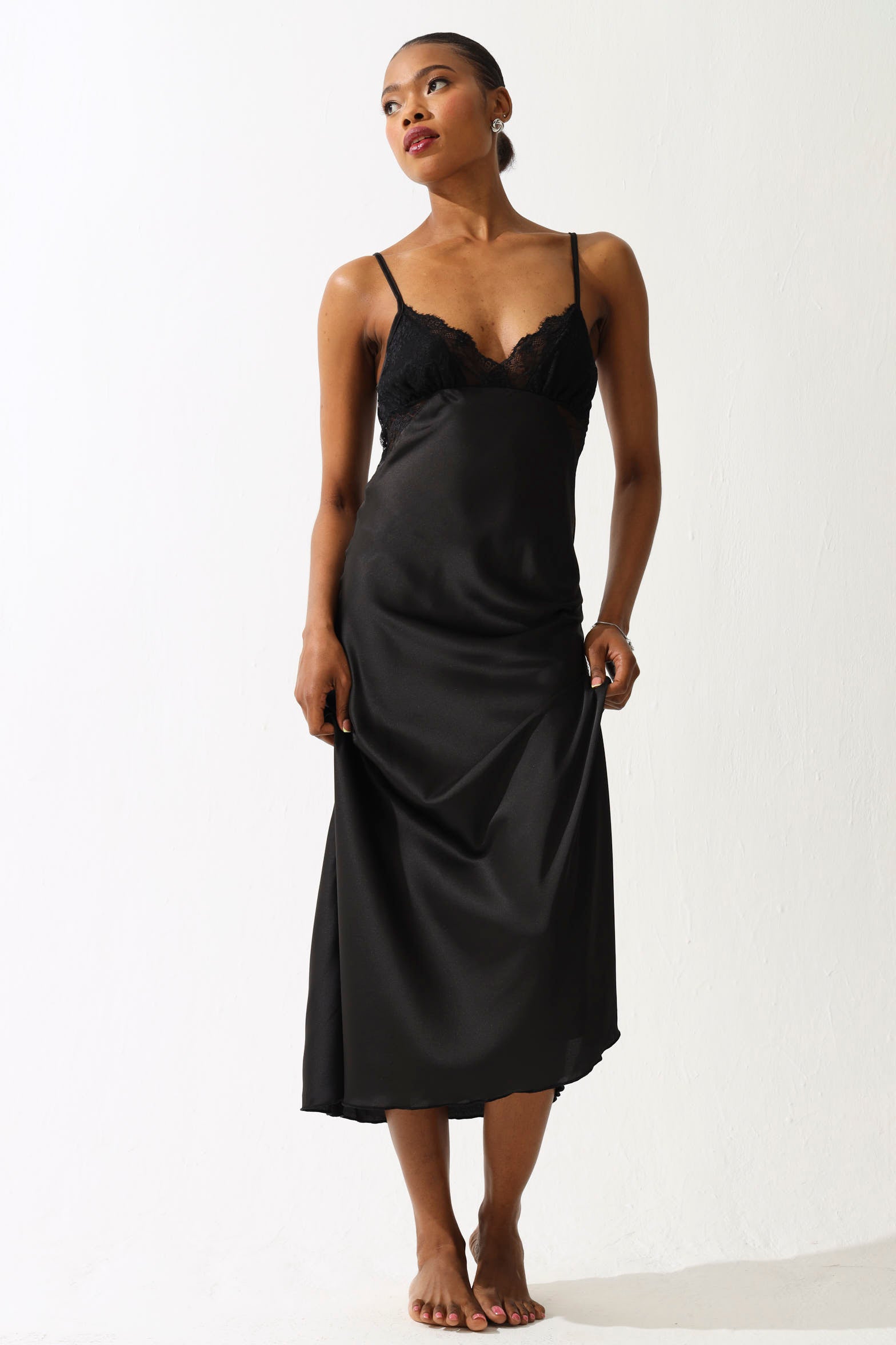 Slip into elegance with this sultry black dress that's pure sophistication meets playful allure. The luxe satin drapes beautifully while delicate lace details add a touch of romance and intrigue. Whether you're layering it under sheer pieces or letting it shine solo, this versatile slip dress transitions seamlessly from day to night. Effortlessly chic, undeniably sexy, and ready for whatever adventure comes your way.