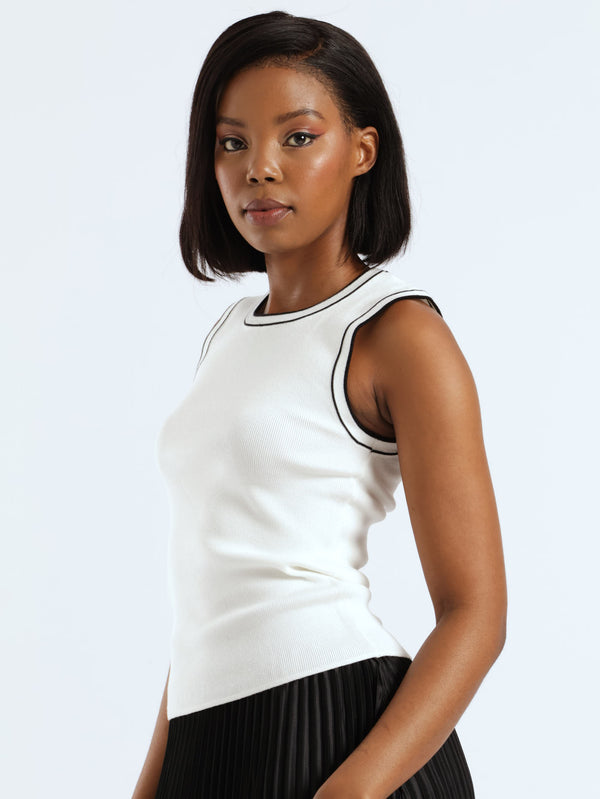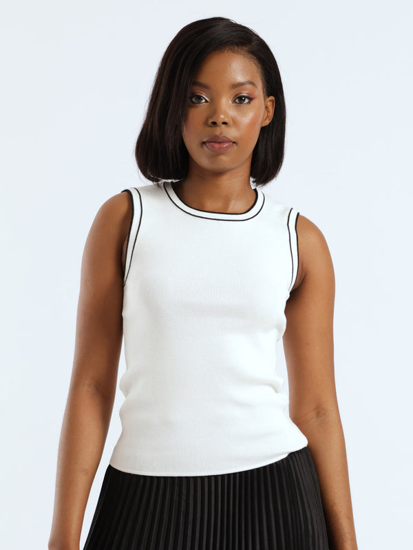 This Sleeveless Tipping Detail Tank Top in White and Black combines minimalist design with refined accents. The subtle tipping detail adds a polished edge to the clean silhouette, making it a versatile piece for layering or wearing solo. Its tailored fit offers understated sophistication for both casual and elevated looks.