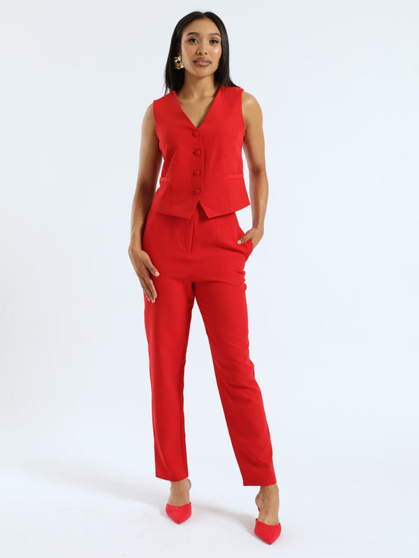 These red slimleg pants combine a tailored silhouette with a bold color for a striking yet elegant look. Designed to contour the legs smoothly, they provide a sleek foundation for both professional and stylish casual outfits. Perfect for making a confident statement with refined simplicity.