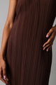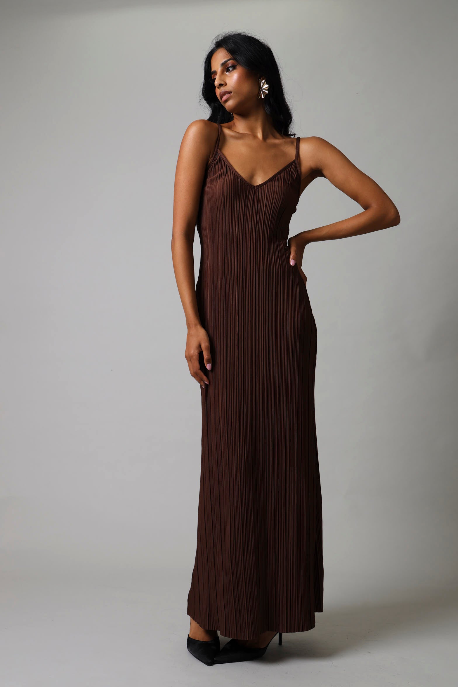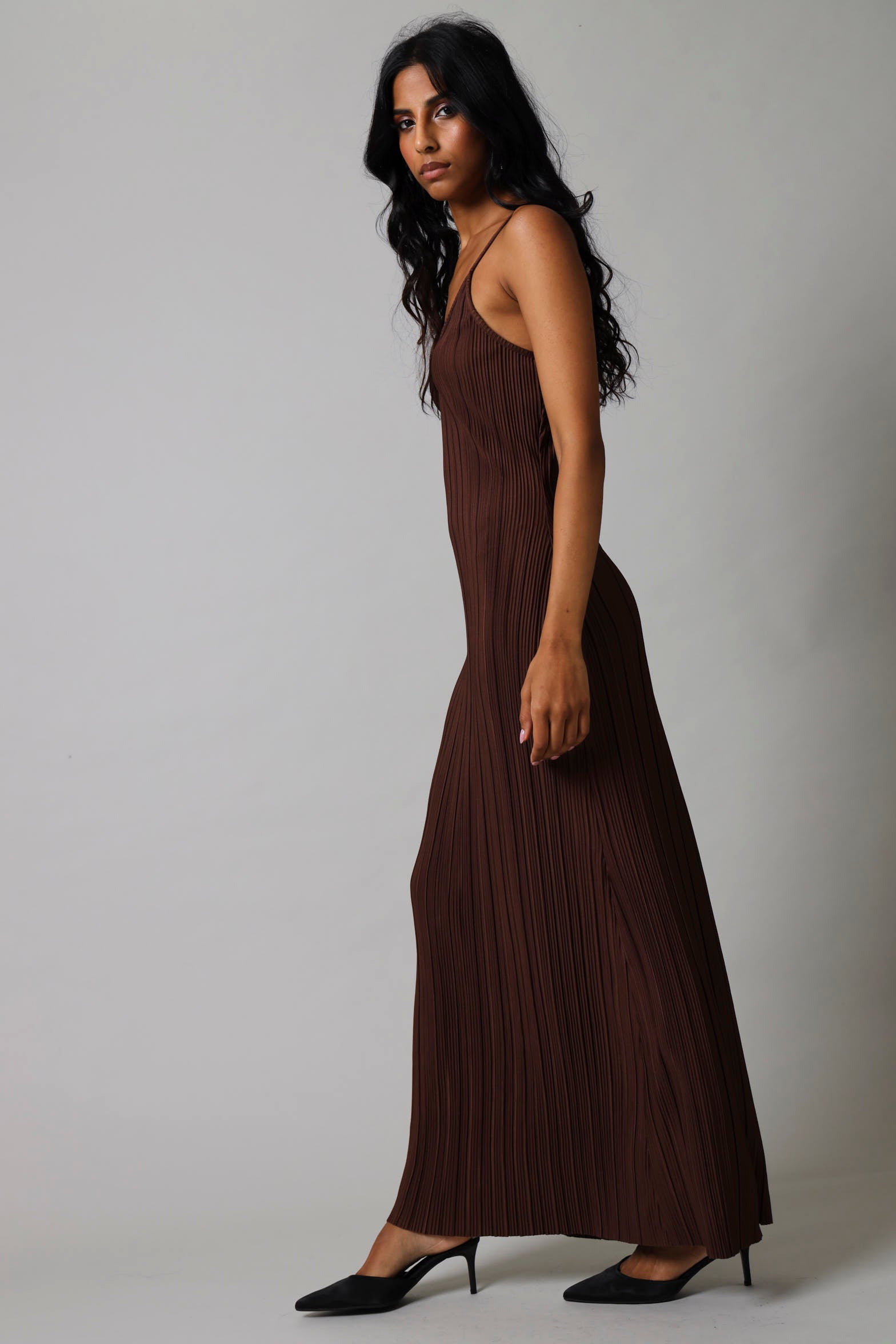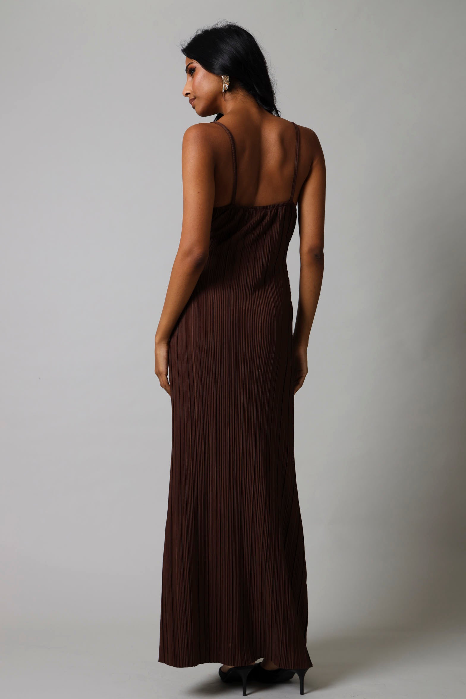 Glide through your day in this stunning maxi dress that combines elegance with a dash of drama. The strappy neckline keeps things interesting while the flare hem adds movement and flair to every step. Crafted in a rich brown that's endlessly versatile, this dress transitions seamlessly from brunch to evening plans. Comfortable, flattering, and ready to become your new go-to for any occasion that calls for effortless sophistication.