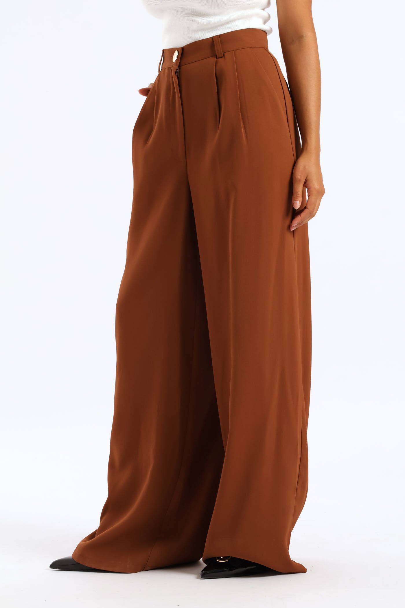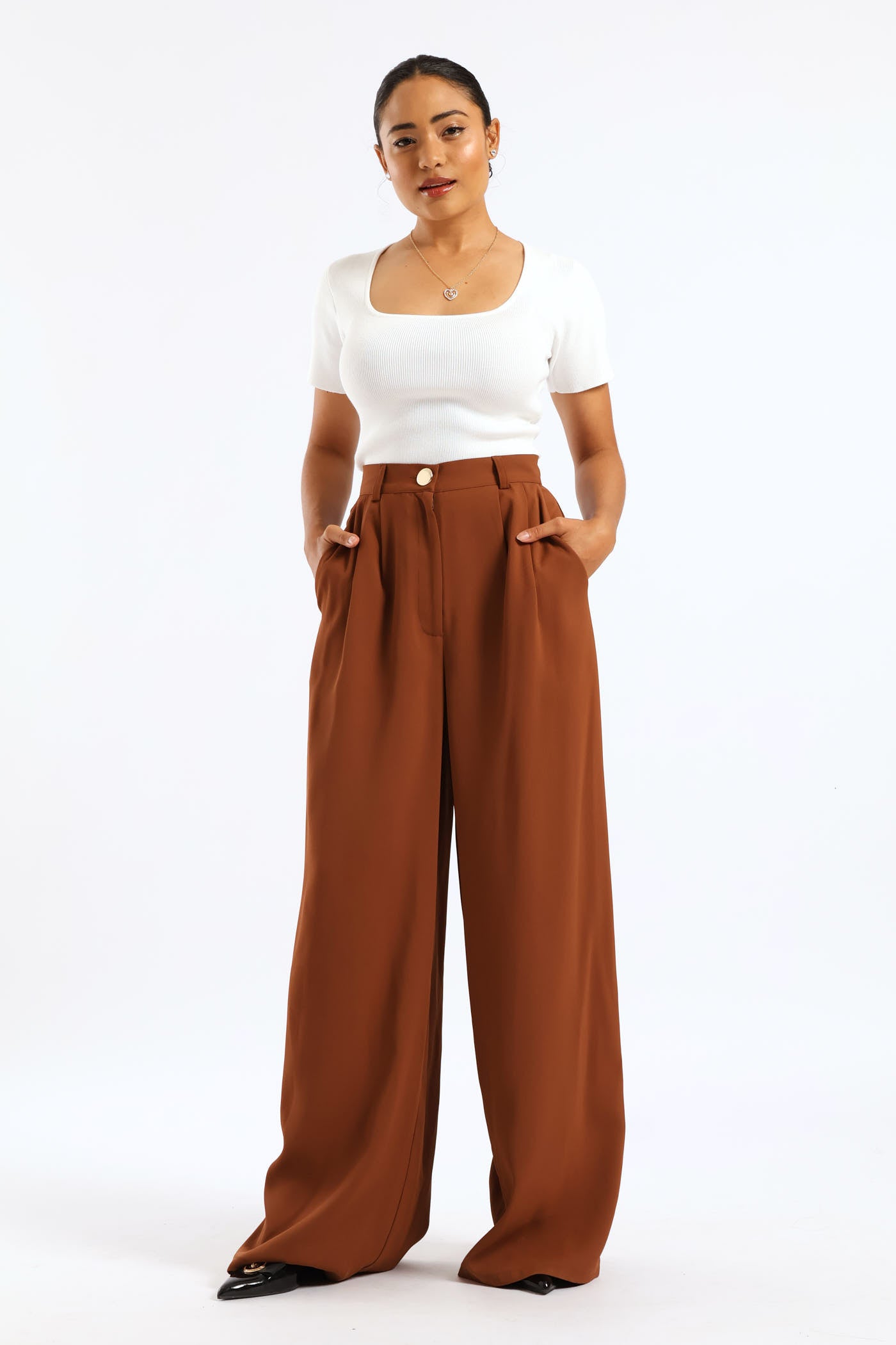 Step out in style with our Pressed Crease Wide Leg Pants in a warm brown shade. Sharp creases meet relaxed wide legs for a look that’s both polished and playful. These pants add a fun twist to your everyday outfit while keeping things effortlessly chic. Perfect for workdays or weekend adventures!