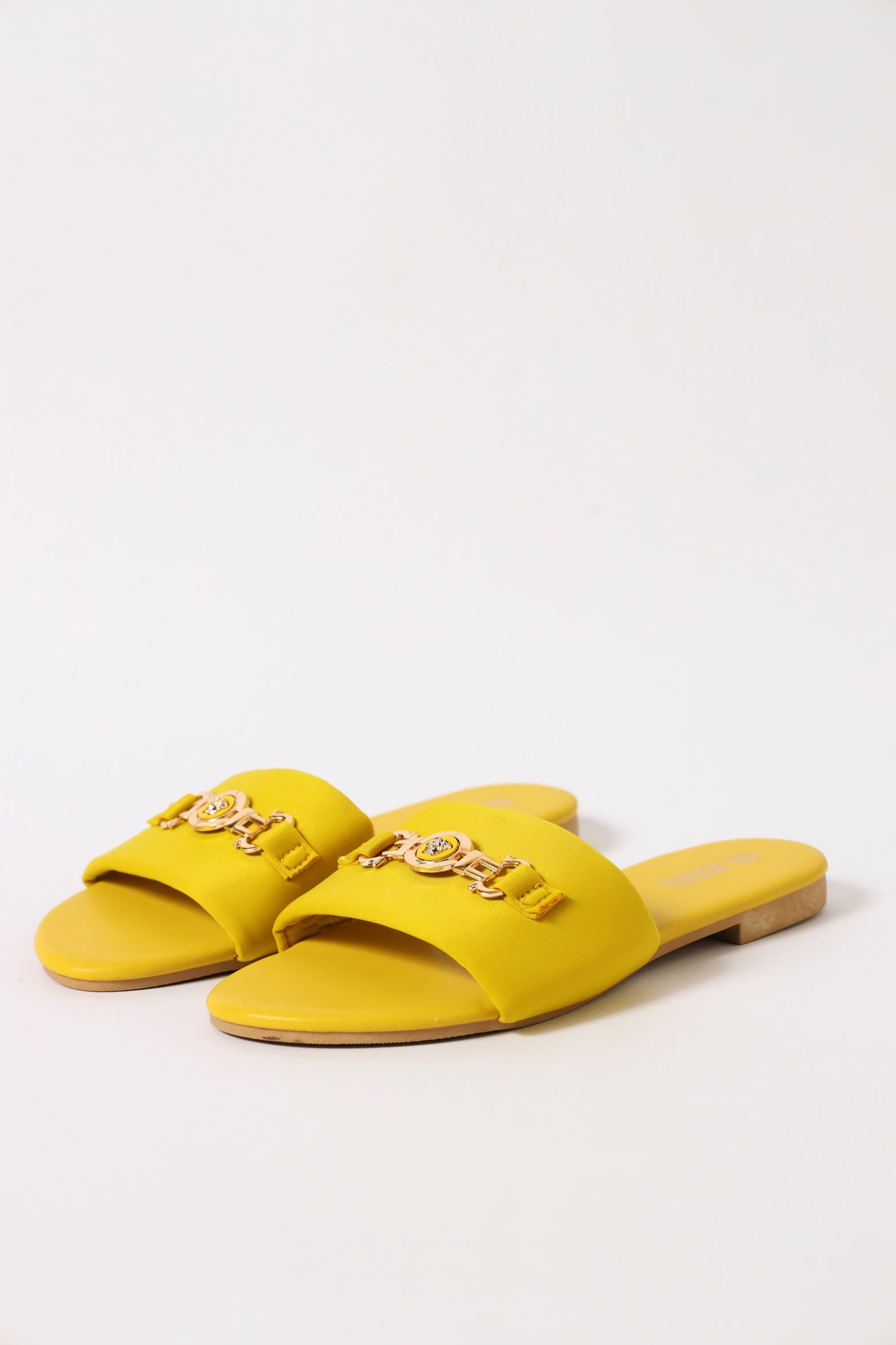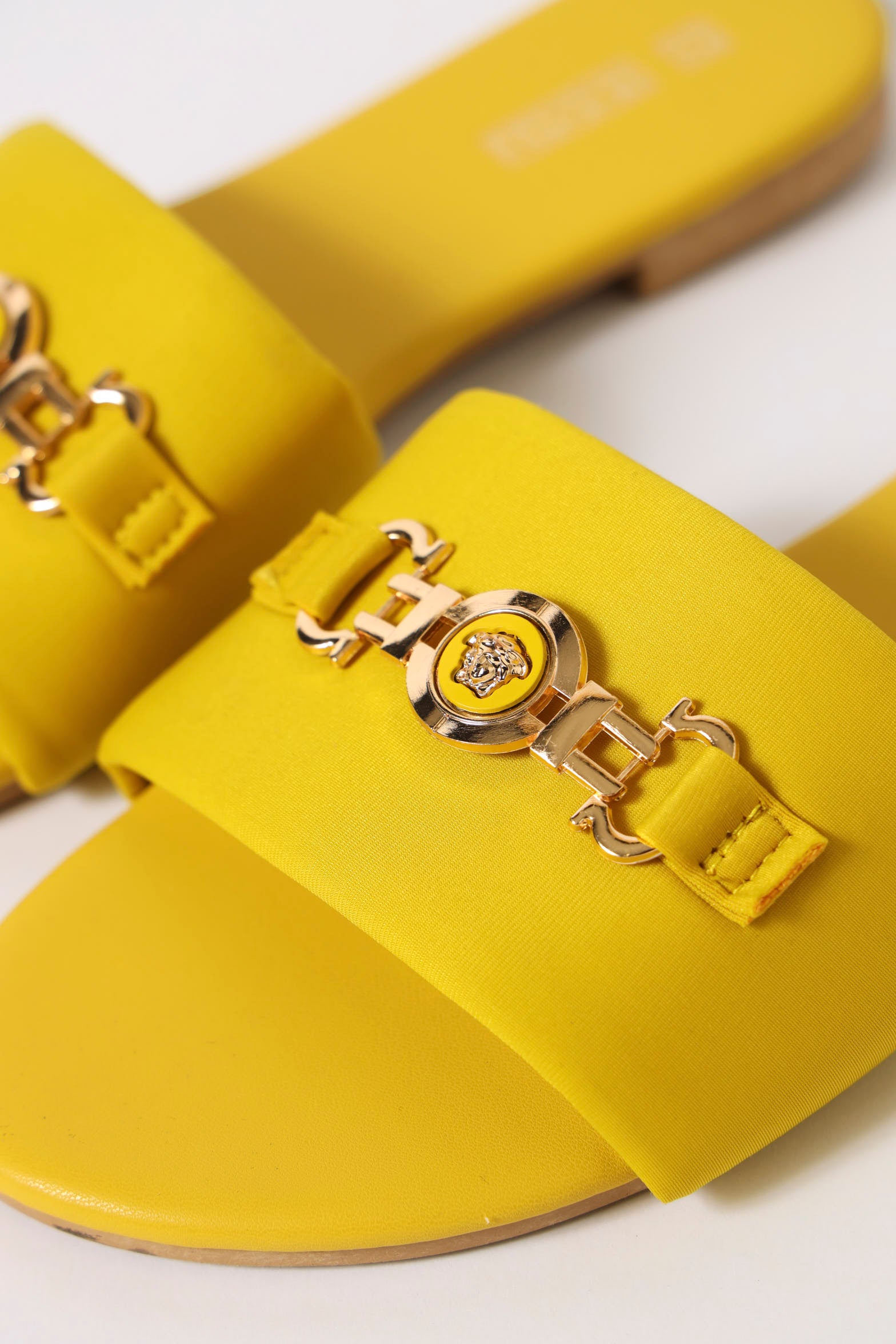 Make a bold statement with these trendy one-strap monogram link trim sandals in vibrant chartreuse! The distinctive monogram link detailing adds a designer-inspired touch, while the single-strap silhouette keeps things modern and streamlined. The eye-catching chartreuse hue brings instant energy and personality to your footwear rotation. Lightweight and comfortable, these sandals are perfect for summer strolls, casual outings, or whenever you want to stand out. Strut your stuff in style!