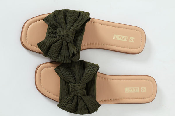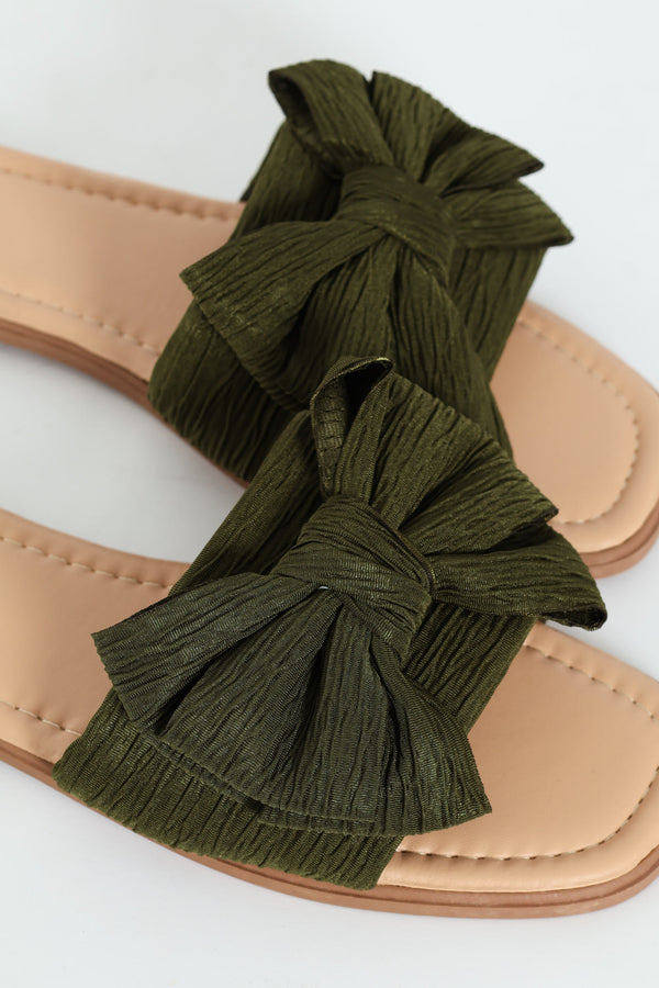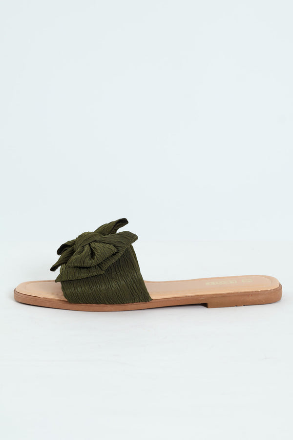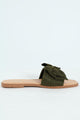 Flat Crinkle Fabric Bow Push In Mule Sandal - Fatigue