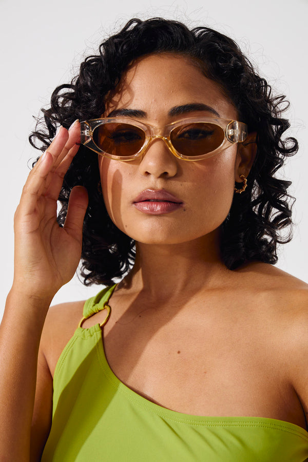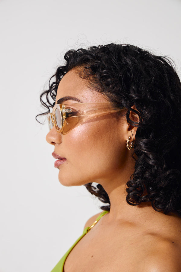 Add some fun and flair to your summer look with these Angled Rectangle Frame Sunglasses in Gold. With a cute and quirky design, these glasses will make your day look shine. Perfect for those who don't take themselves too seriously (wink wink).