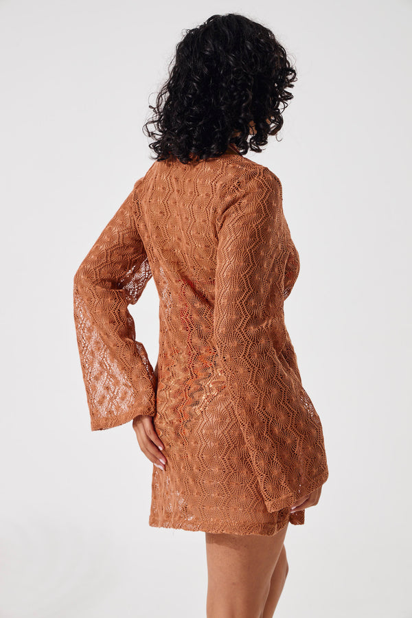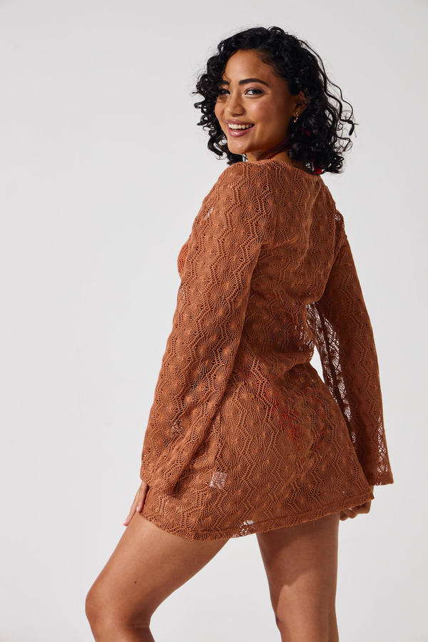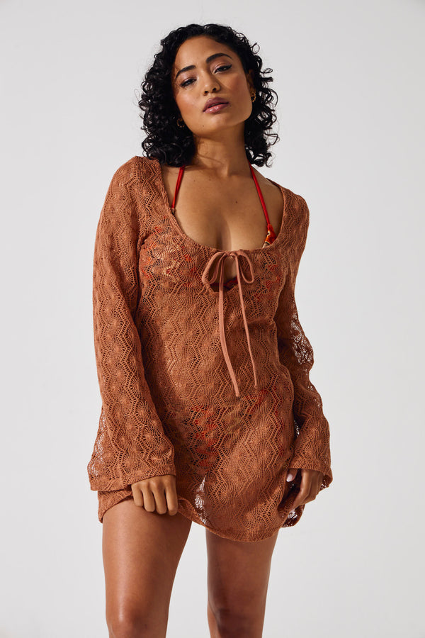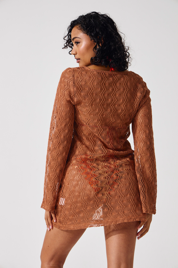 Step into effortless style with the Lace Coverup Dress in warm brown. Its delicate lace fabric adds a flirty touch while keeping you cool and comfortable. Perfect for layering over your favorite swimwear or wearing as a breezy summer dress, it combines charm and ease for any sunny day adventure.