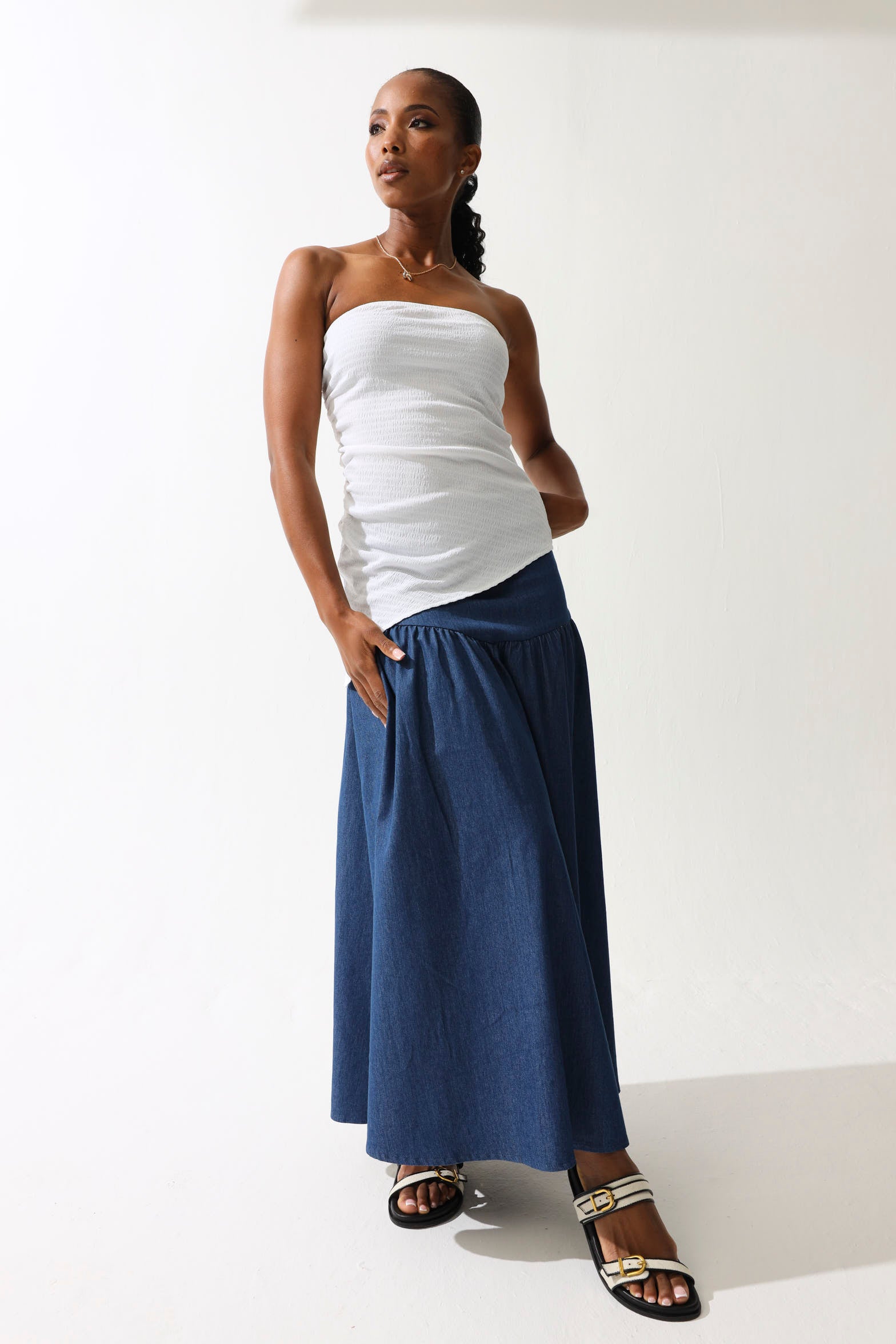 Ditch the boring basics and embrace effortless edge with this asymmetrical strapless wonder. The crinkle knit fabric adds texture and movement, while the off-center cut keeps things fresh and fashion-forward. Slip it on for an instant vibe upgrade—whether you're heading out for brunch or a night on the town. Cream-colored perfection that pairs with literally everything in your wardrobe.