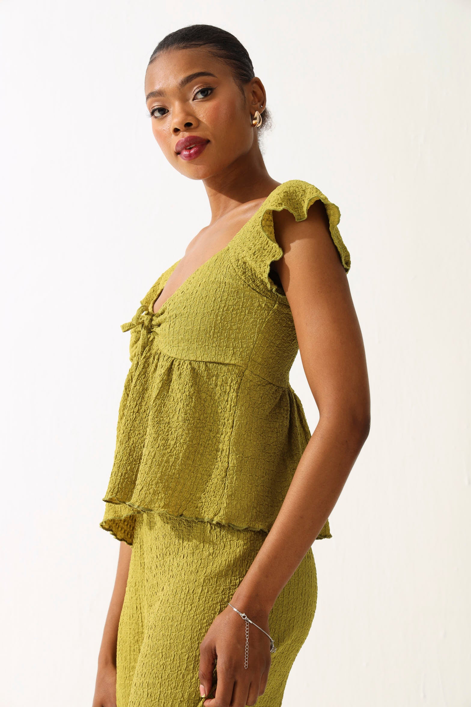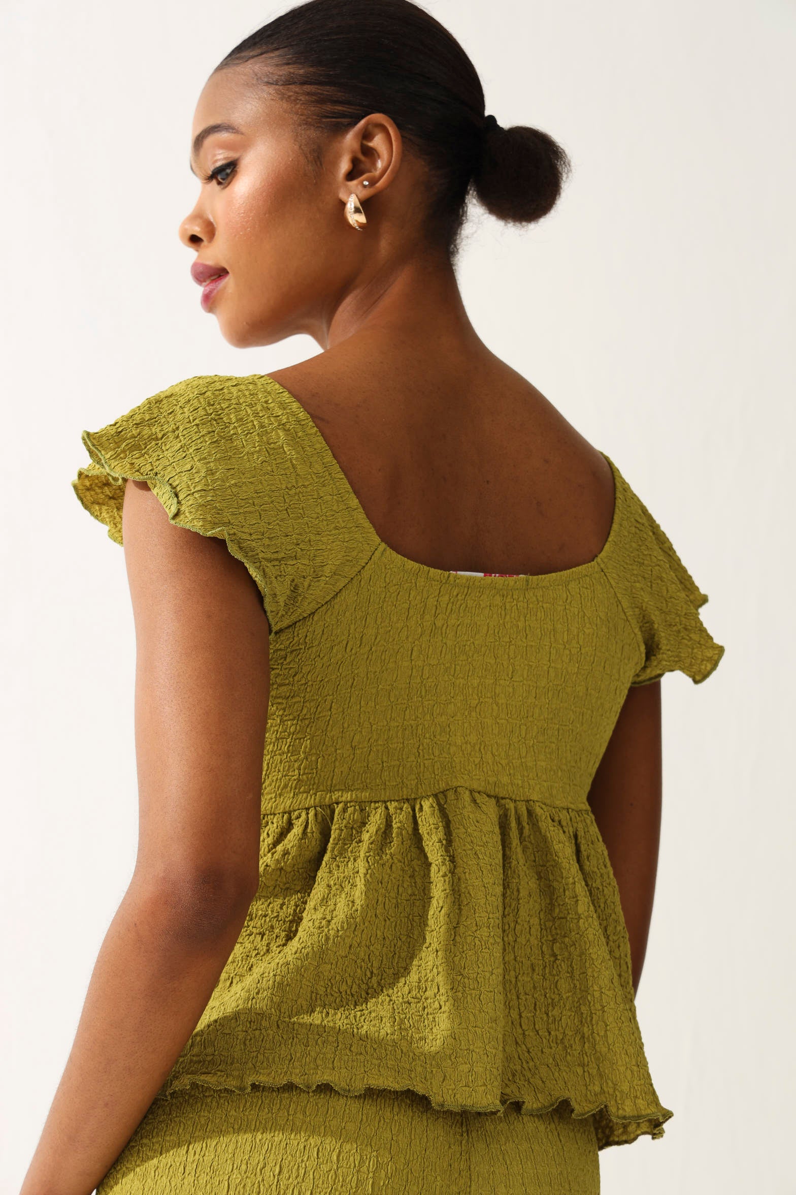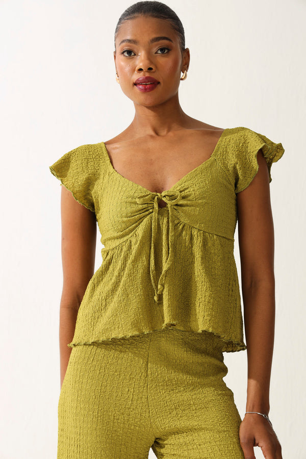 Elevate your everyday style with this cheeky crinkle knit peplum top in rich olive. The textured fabric adds dimension and movement, while the playful peplum hem creates a flattering silhouette that's equal parts fun and fabulous. Perfect for dressing up or down, this versatile piece transitions seamlessly from office to weekend adventures. Pair it with your favourite jeans or dress it up for a night out—this olive beauty is your new wardrobe MVP.