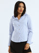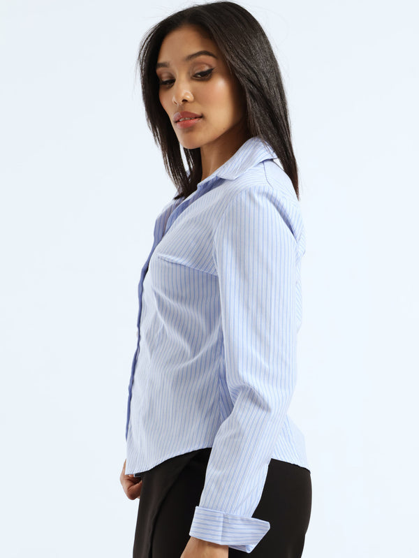The Long Sleeve Fitted Stripe Poplin Shirt in white and blue offers a crisp, tailored look perfect for refined wardrobes. Crafted from lightweight poplin fabric, it features subtle stripes that enhance its sleek silhouette. This shirt combines timeless elegance with a flattering fit, ideal for polished office wear or sophisticated casual styling.