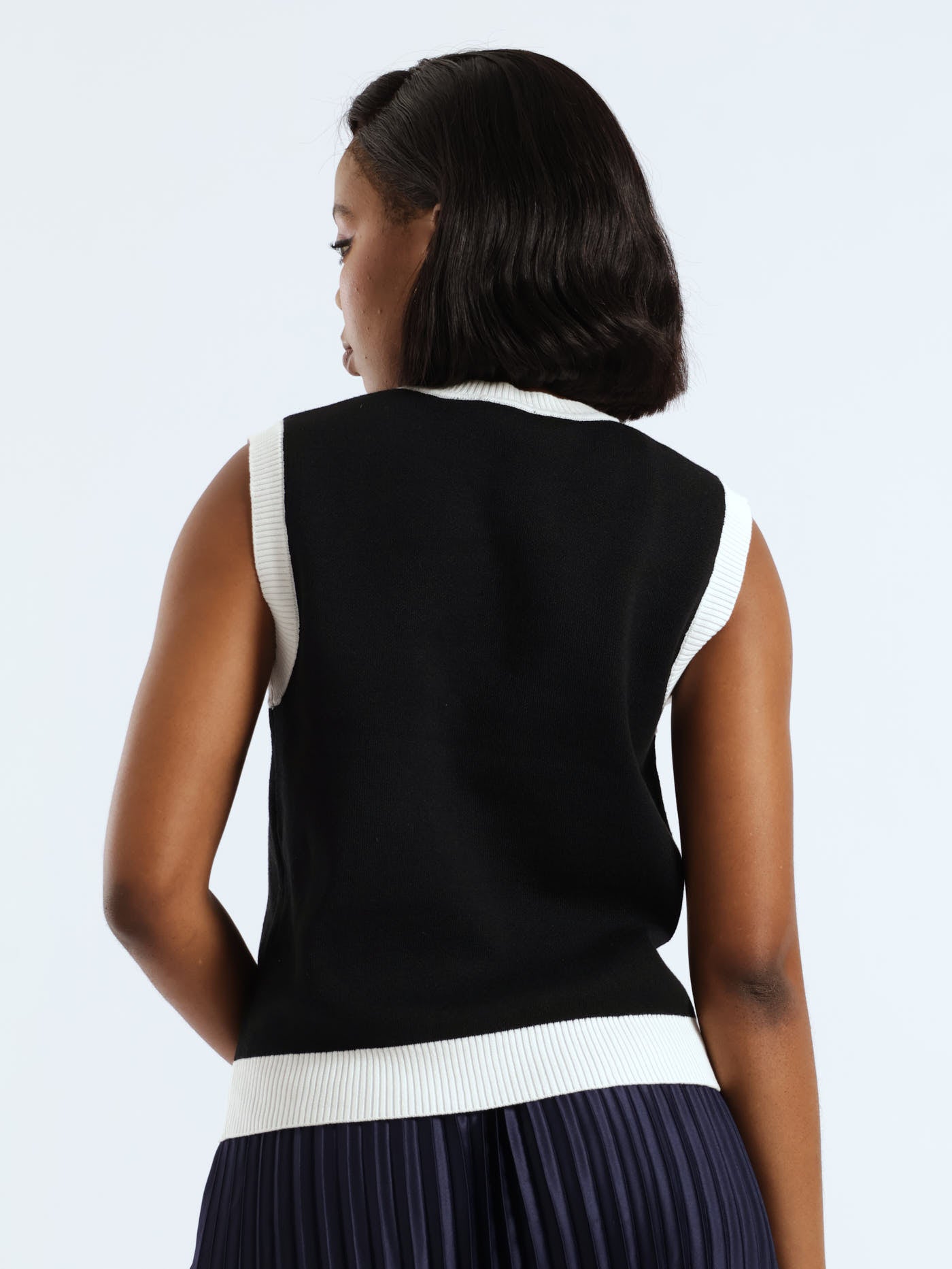 Refined and versatile, this Sleeveless Contrast Knitwear Top in black and white combines a clean silhouette with striking contrast details. Crafted for a comfortable yet polished fit, it pairs effortlessly with tailored trousers or skirts, making it ideal for both professional settings and elegant casual looks.