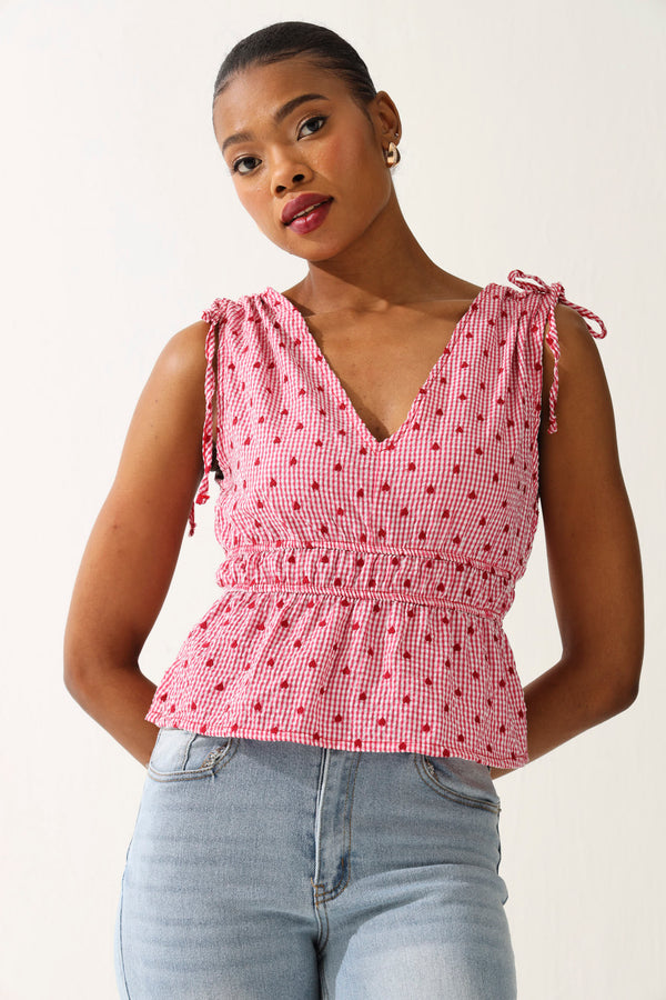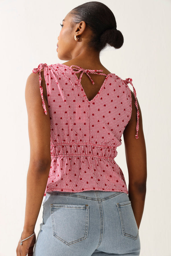 Meet your new go-to for effortless charm—this sleeveless gingham blouse in soft pink is basically a love letter to classic style with a fun twist. The ruched waist detail cinches you in all the right places, creating a flattering silhouette that works whether you're dressing it up or keeping it casual. Pair it with high-waisted trousers for office elegance, denim for weekend vibes, or a skirt for that picture-perfect brunch moment. Simple, chic, and impossibly versatile.