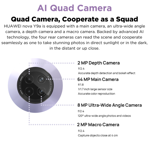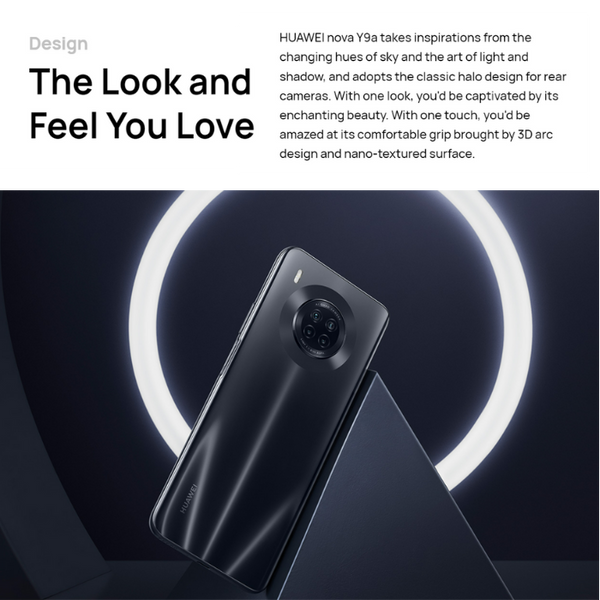 Admire the double-coated finish of HUAWEI Nova Y9a as you take hold of the easy-grip, ultra-thin, lightweight 175 g body and get inspired by infinite possibilities via the iconic star orbit ring, which brings even more eye-catching beauty to every moment.