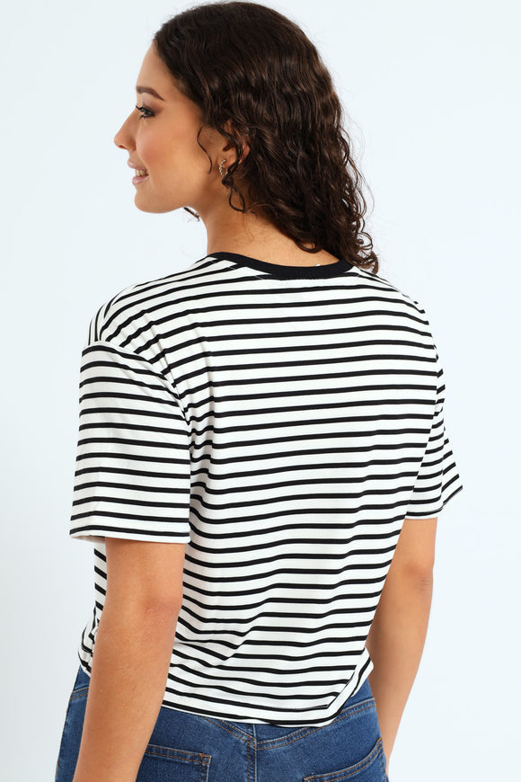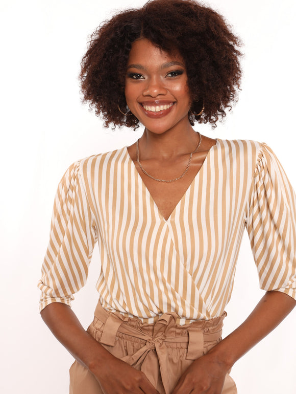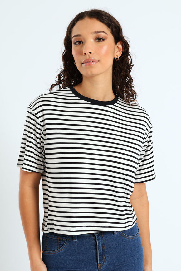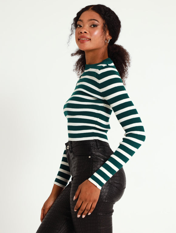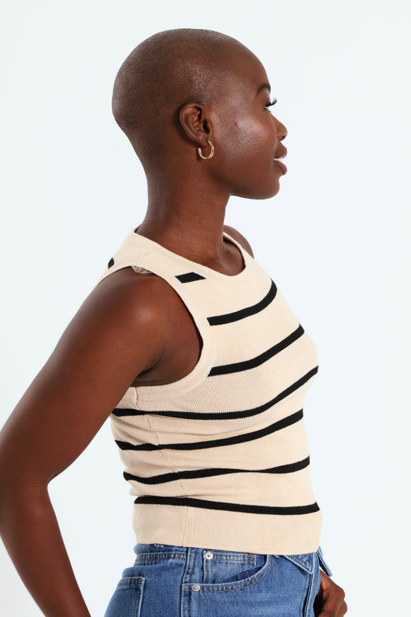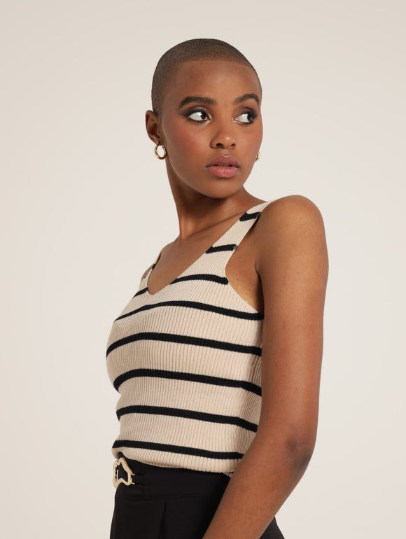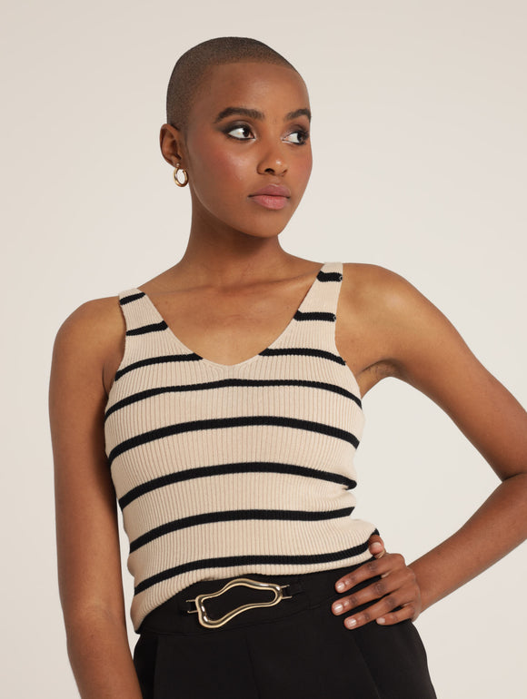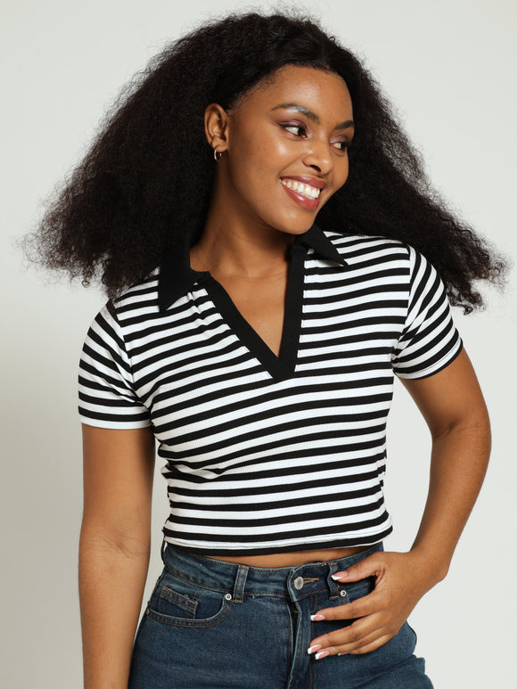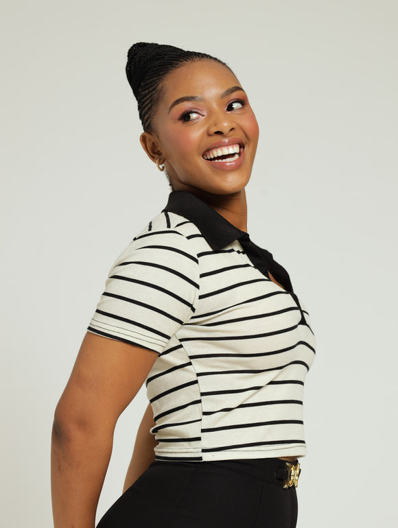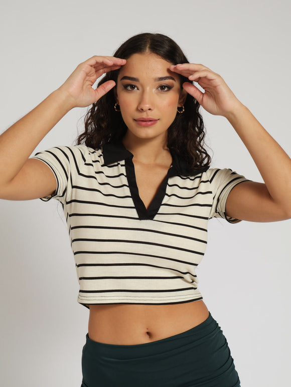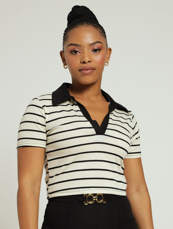 Stripe Johnny Collar Seamless Top - Black/Beige