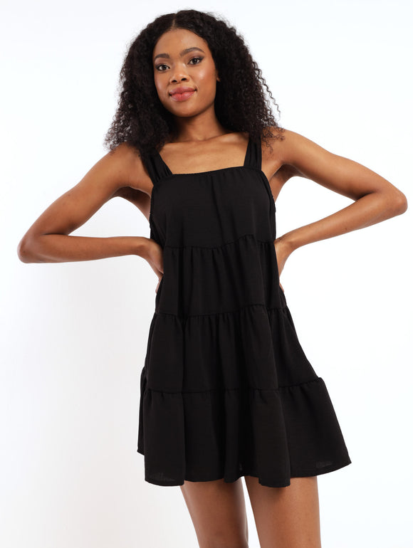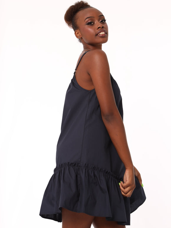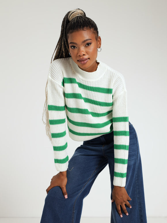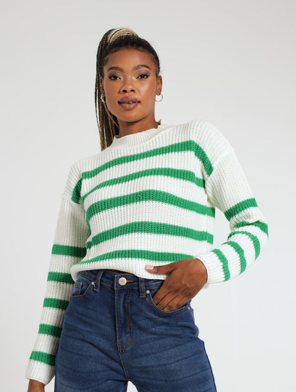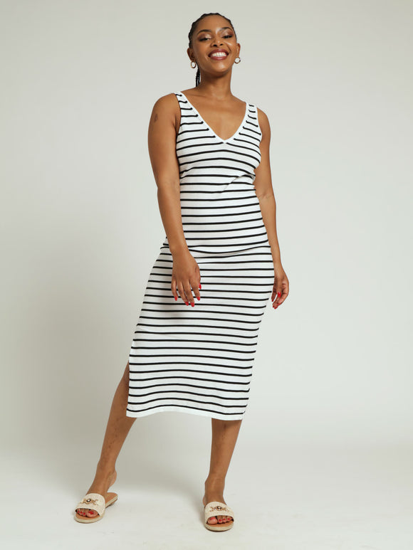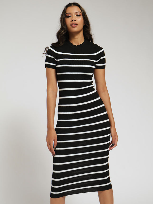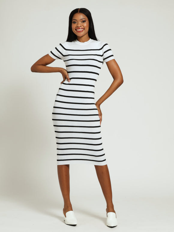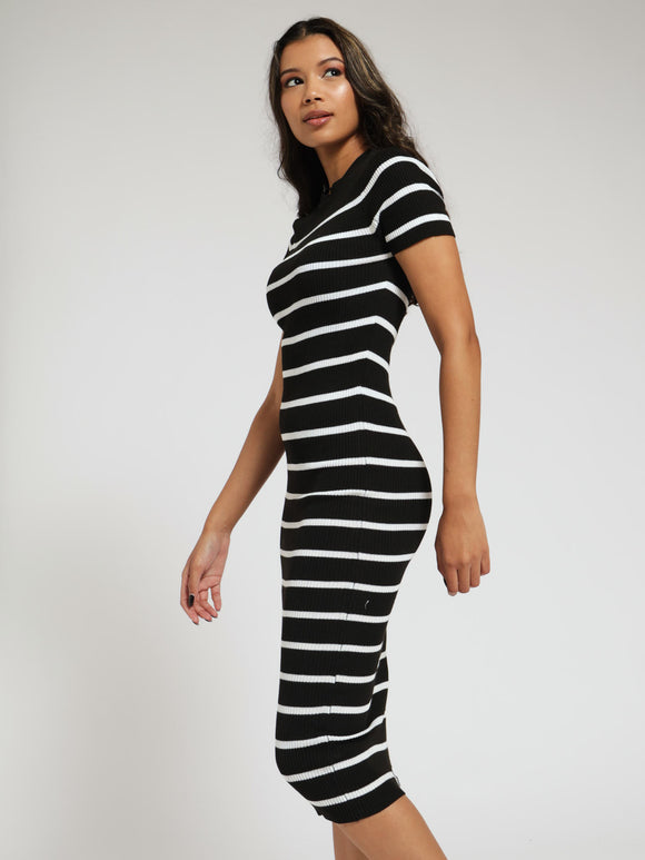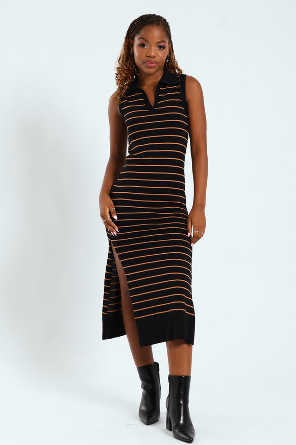 Stripe Johnny Collar Knitwear Midi Dress - Black/Beige