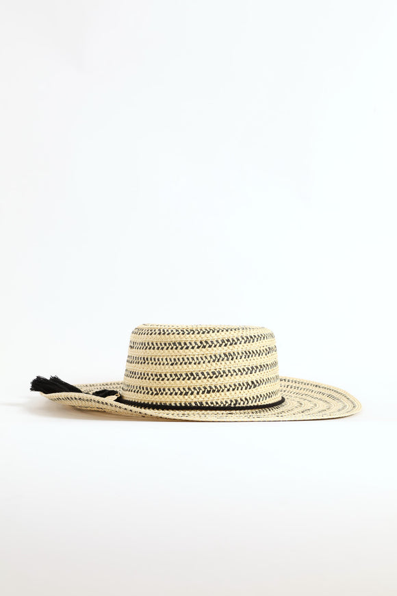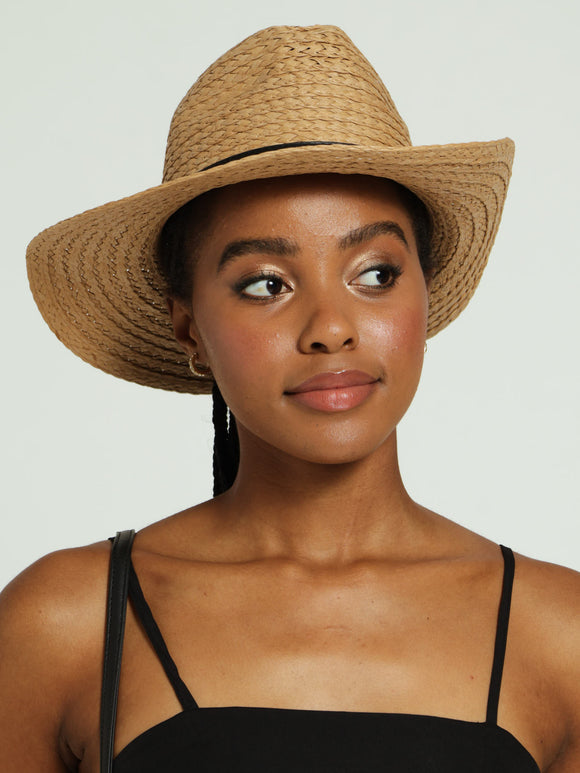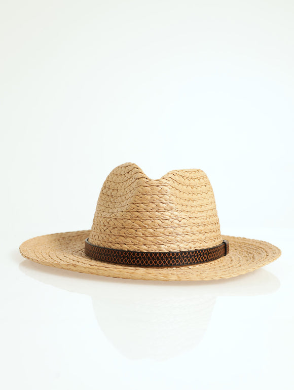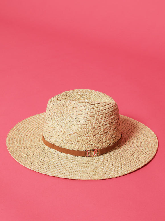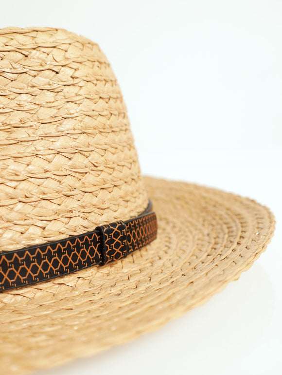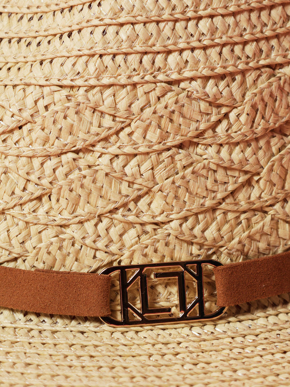Straw Fedora Hat With Monogram Metal Plaque - Natural