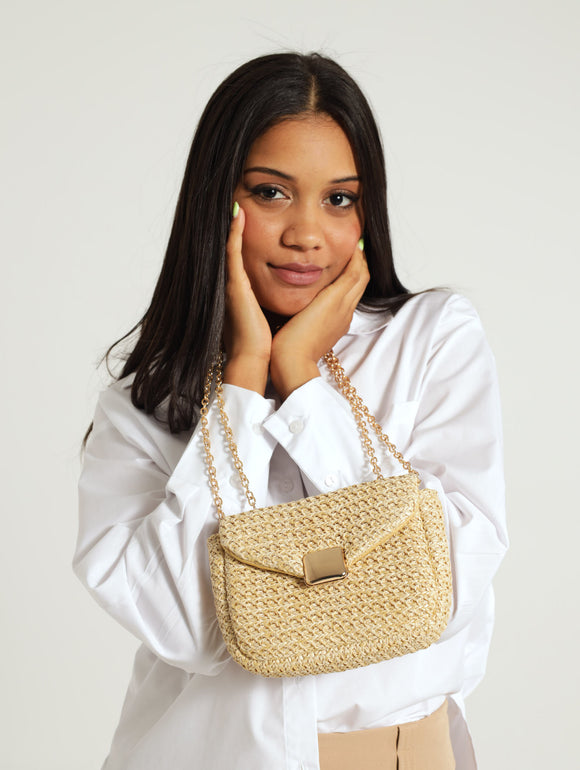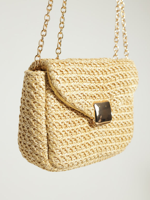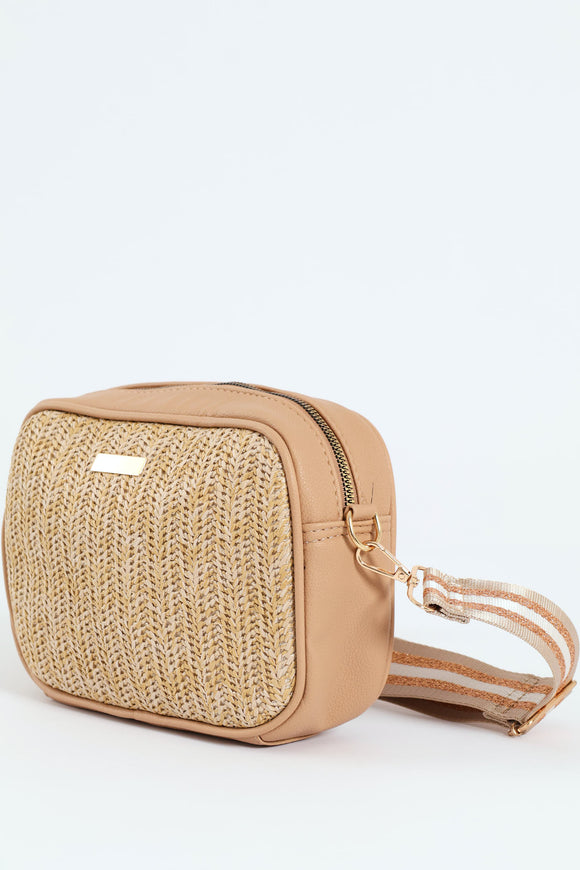 Straw Messenger Bag With Printed Canvas Straps - Natural