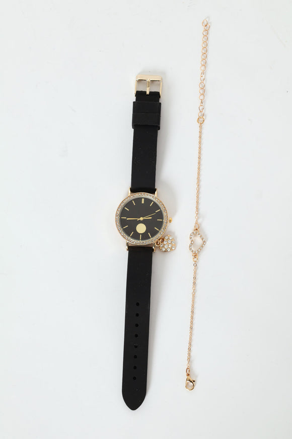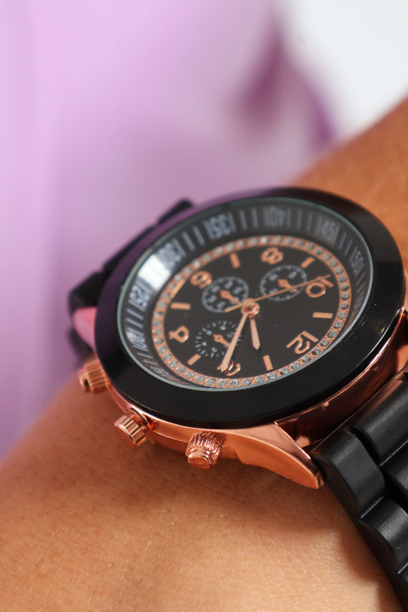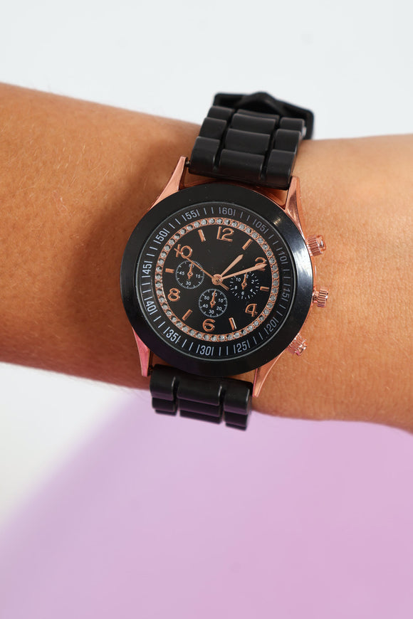Diamante Dial Rubber Linked Strap Watch - Black