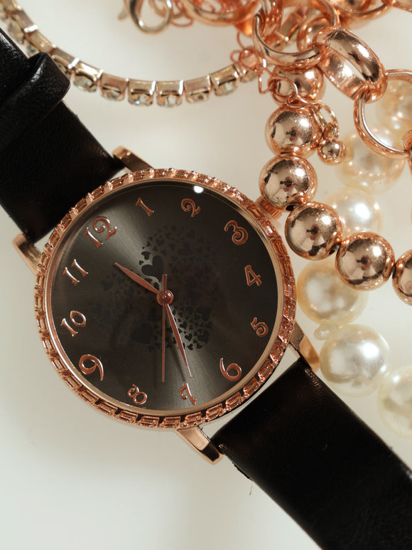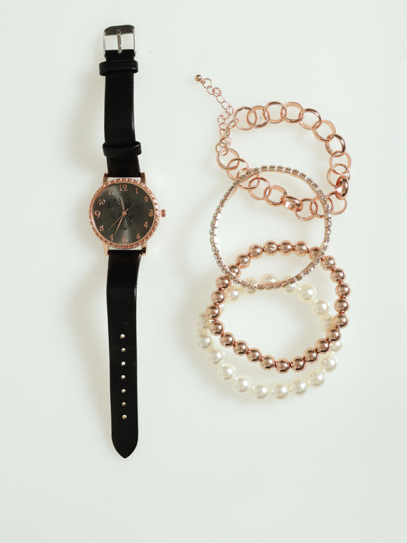 Diamante Dial Pu Strap Watch With 4 Bracelets - Rose Gold