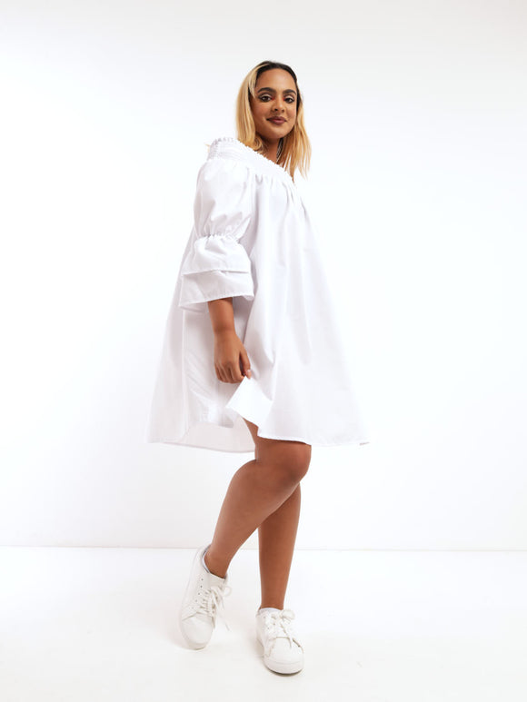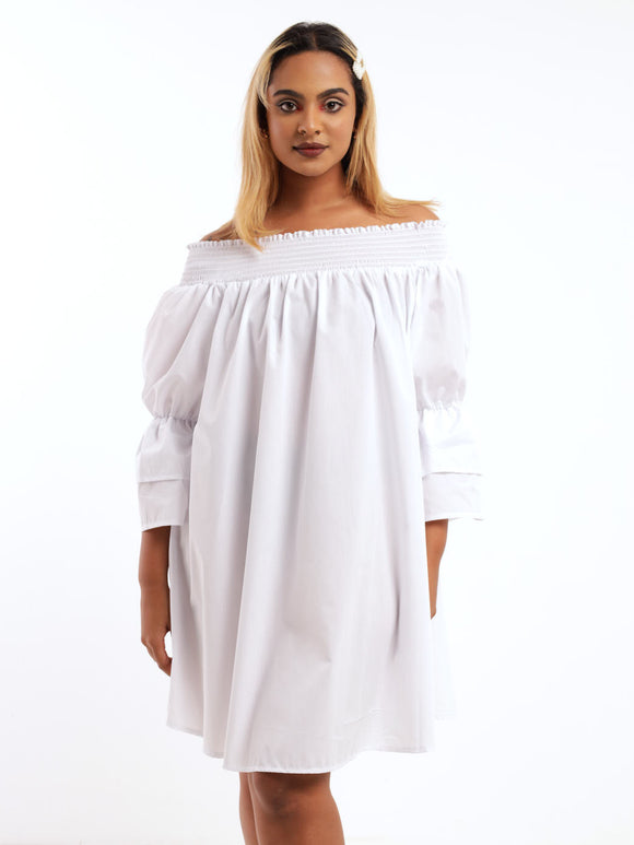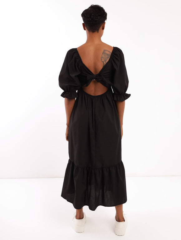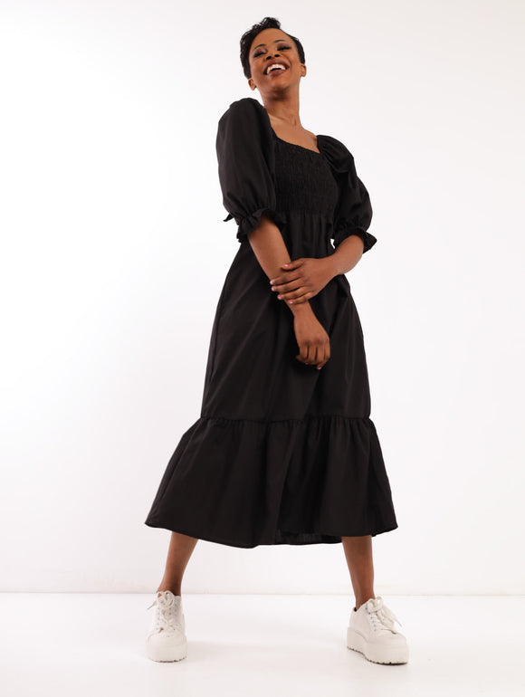 Shirred Bodice Polka Midi Dress - Black/Cream