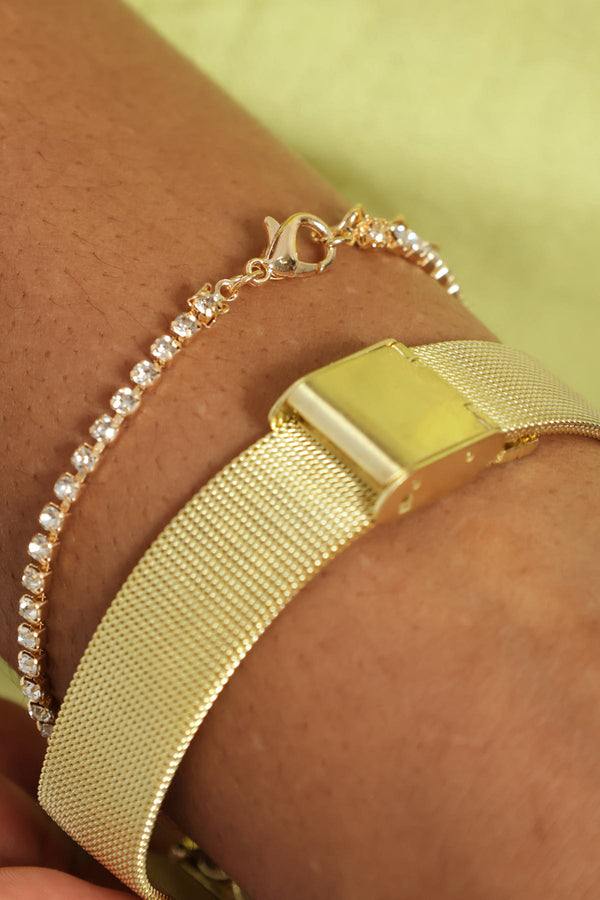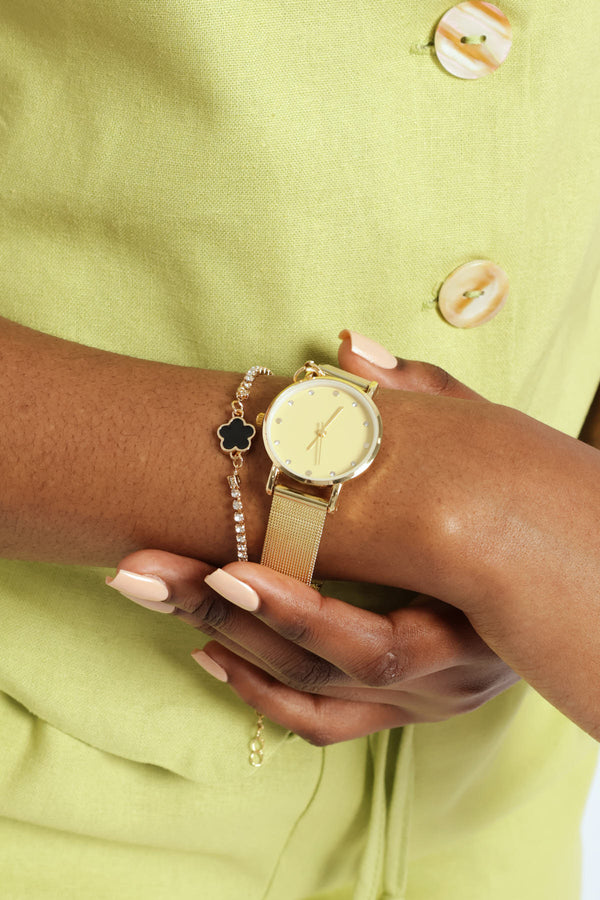 Charm Detail Mesh Strap Watch & Epoxy Bangle Set - Gold