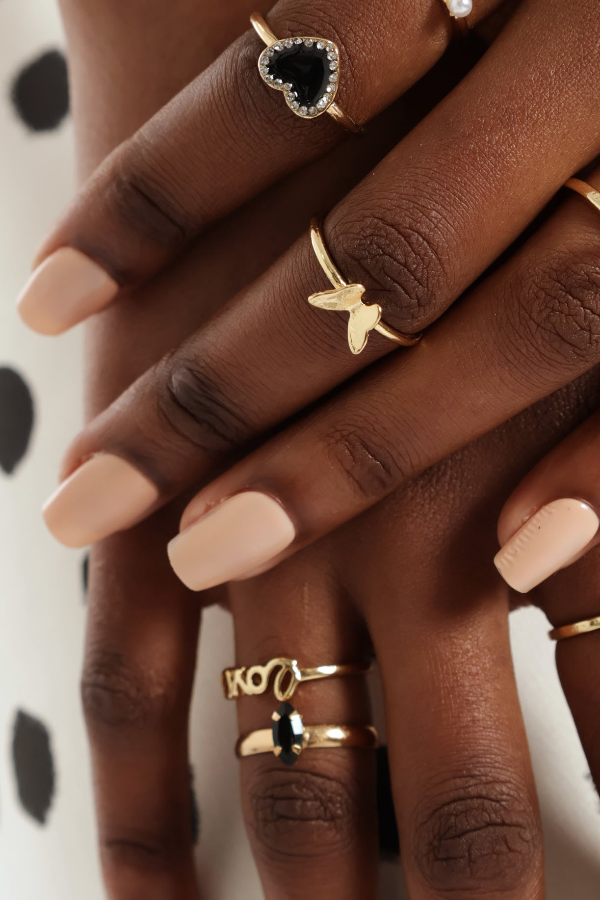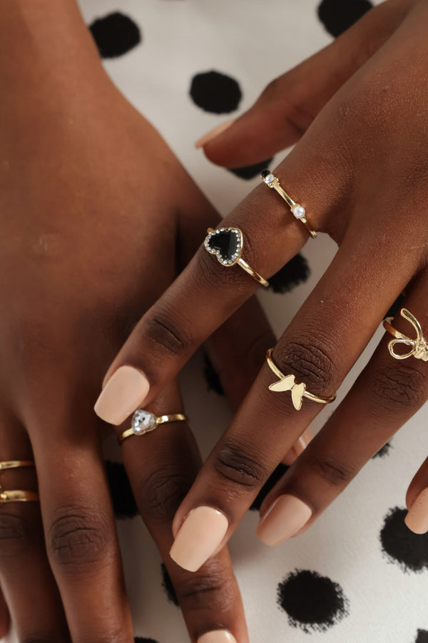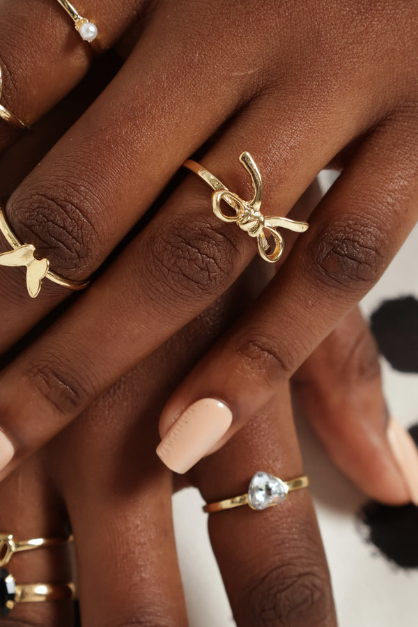 7 Pack Epoxy & Diamante Heart & Bow Rings - Gold