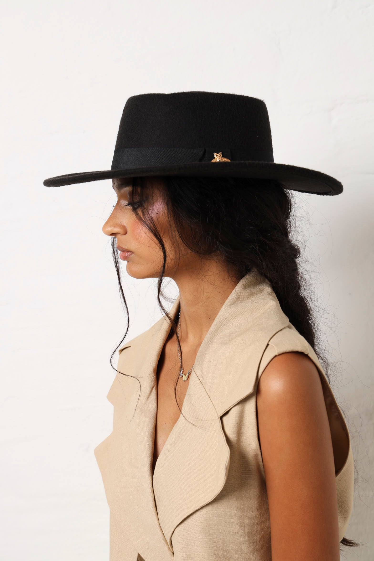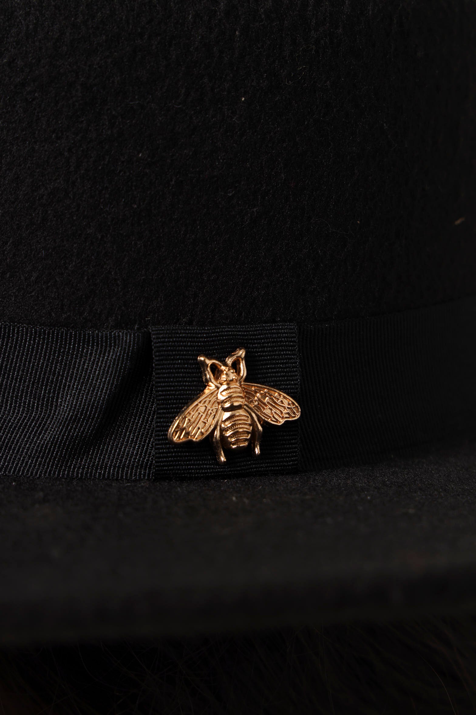Buzz into style with this charming felt boater hat featuring a delightful bee trim detail. Perfect for adding a whimsical touch to any outfit, this classic black boater combines timeless elegance with playful personality. Whether you're heading to a garden party or just want to make a statement, this hat delivers charm and character in one adorable package.
