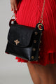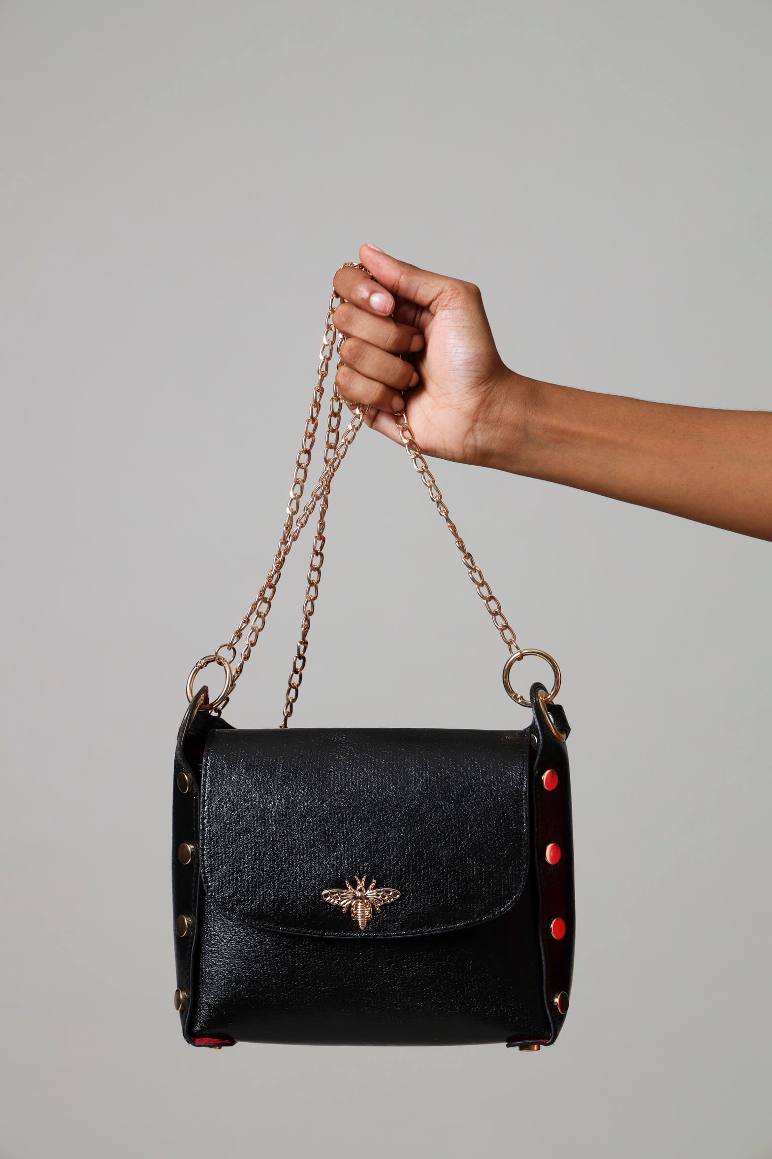 Buzz into style with this striking satchel that's the bee's knees of accessory game. Featuring bold black leather accented with shimmering gold bee trim and edgy side studs, this bag brings personality to every outfit. The structured satchel silhouette keeps your essentials organized while the statement details ensure you're never just another face in the hive. Perfect for those who dare to stand out with a touch of glamour and attitude.