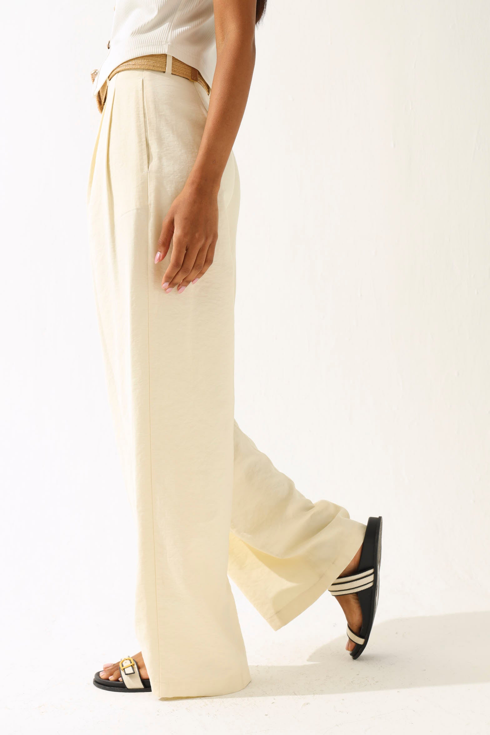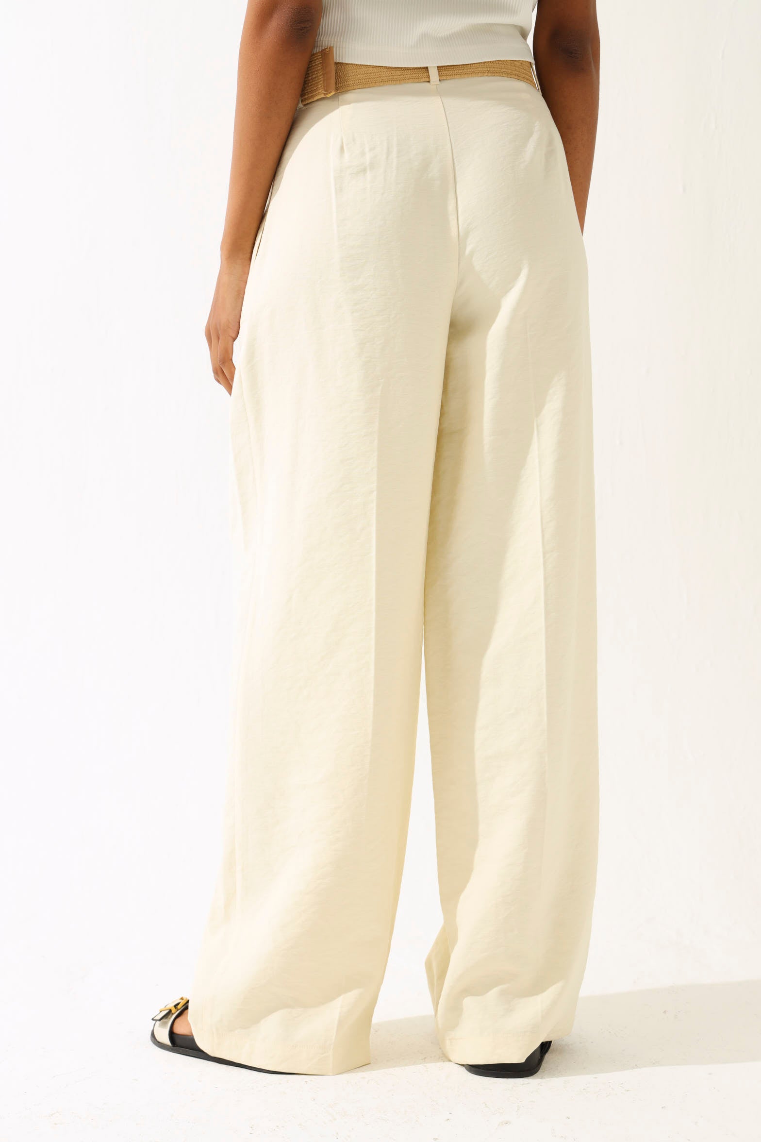 Belted Linen Look Wide Leg Pants - Cream