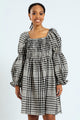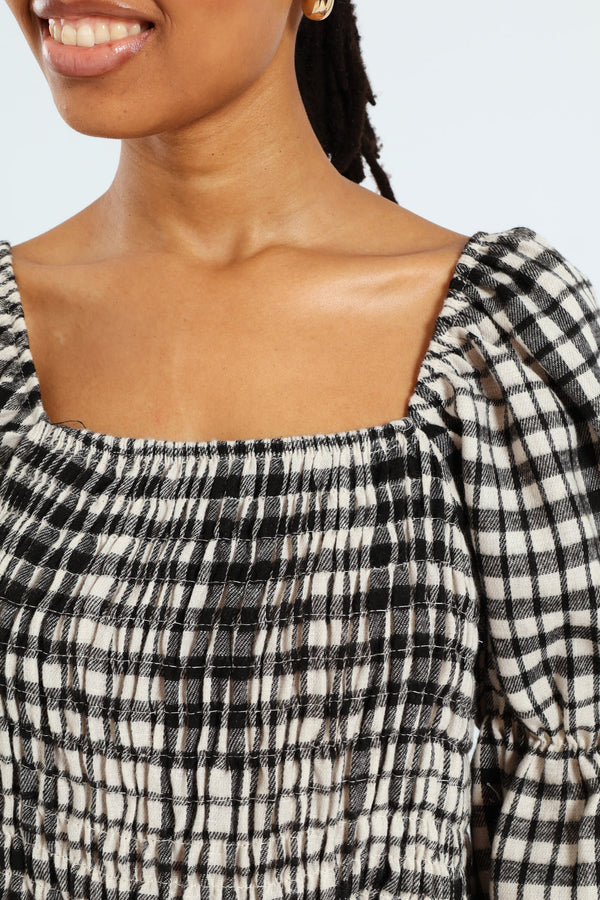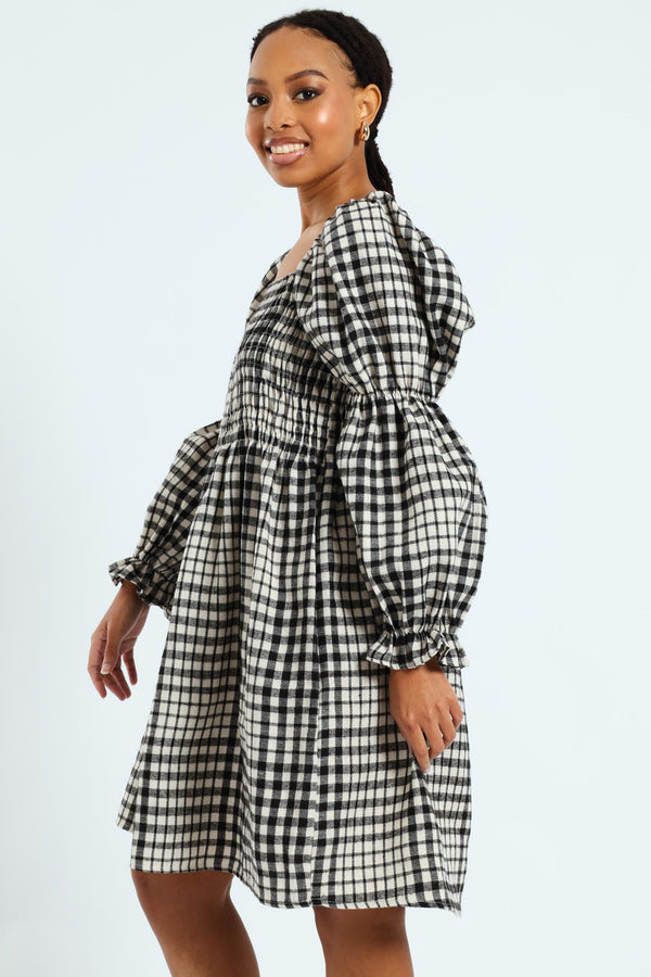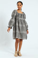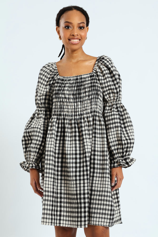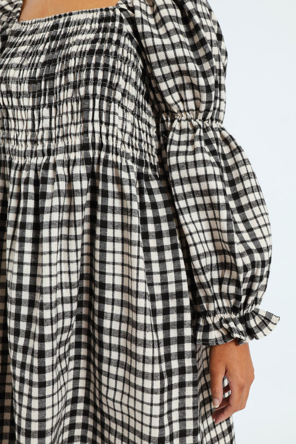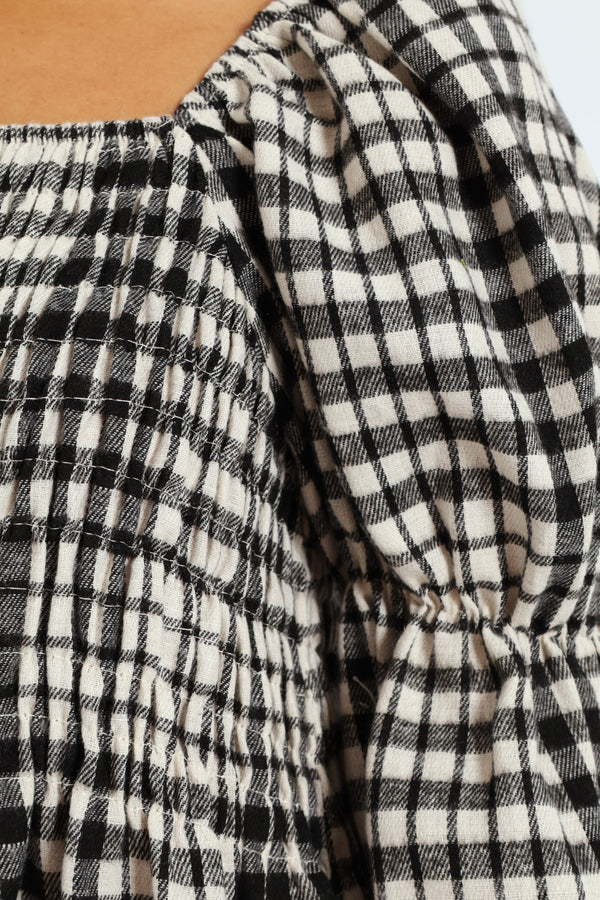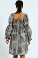 Bubble Sleeve Check Woven Midi Dress - Black/Cream