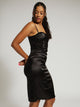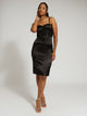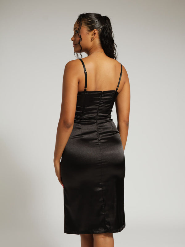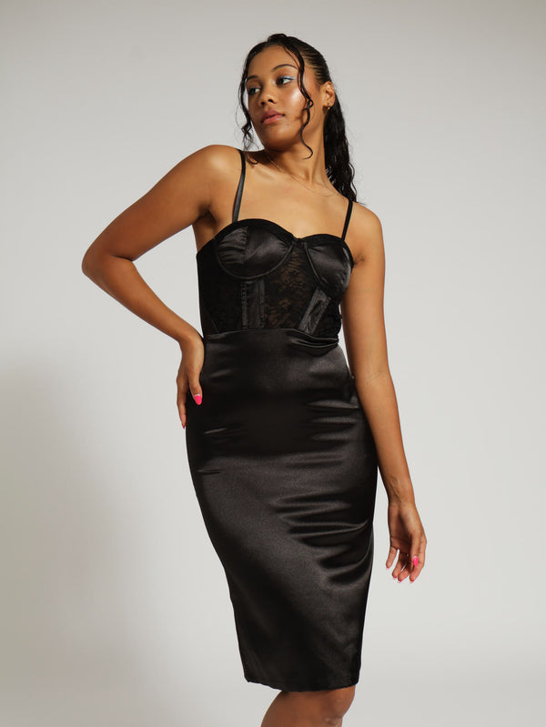 Transform into a sultry goddess with our Corset Lace Satin Mini Dress! Featuring a corset bodice adorned with delicate lace, this little black dress hugs your curves in all the right places.