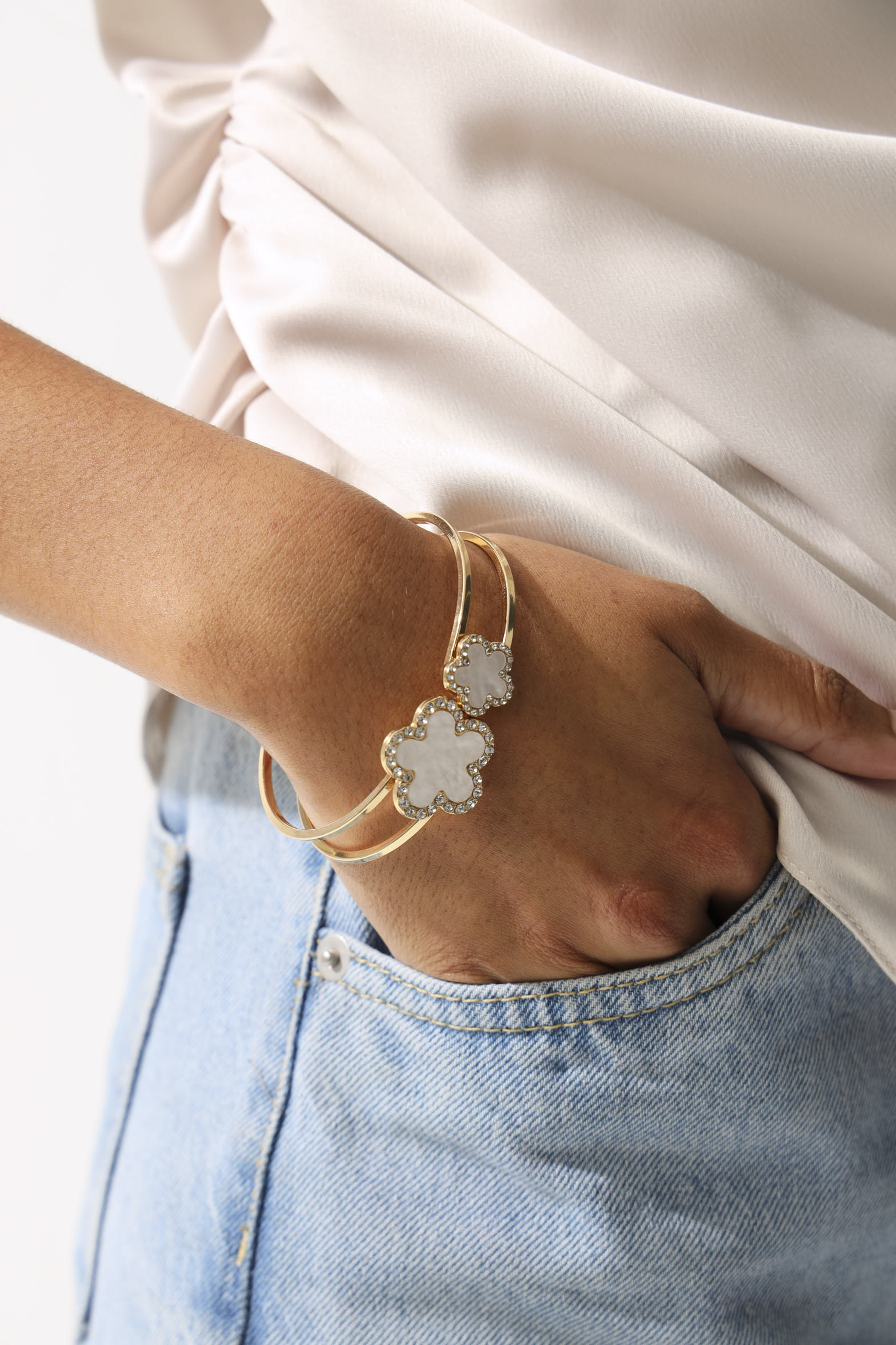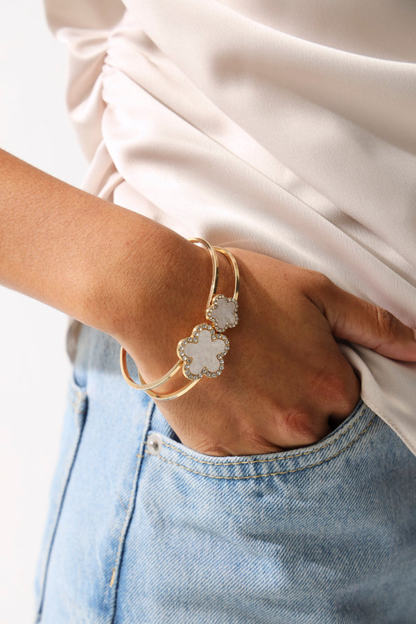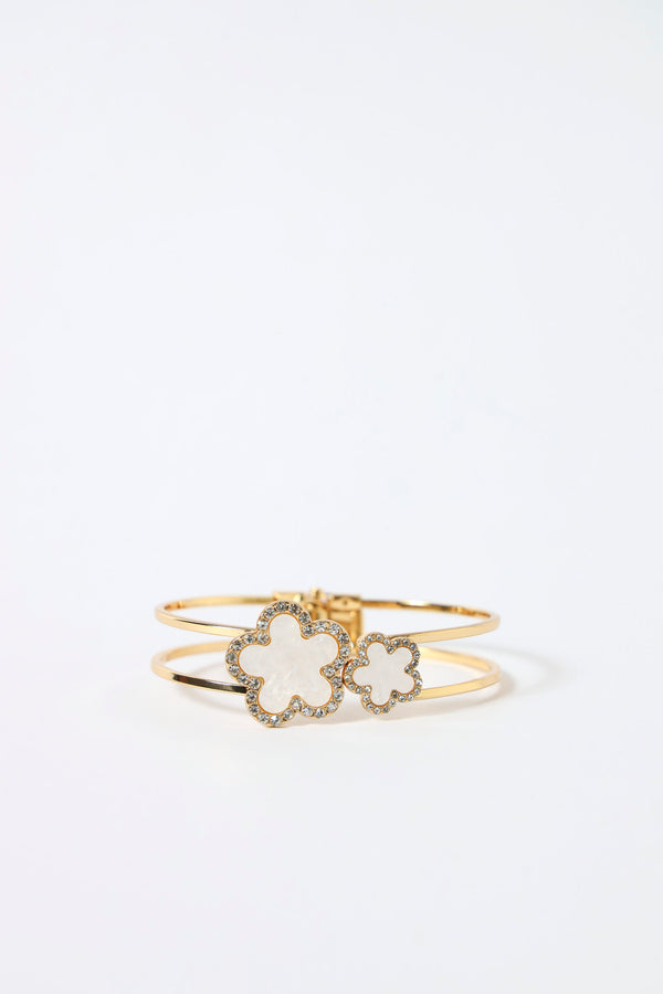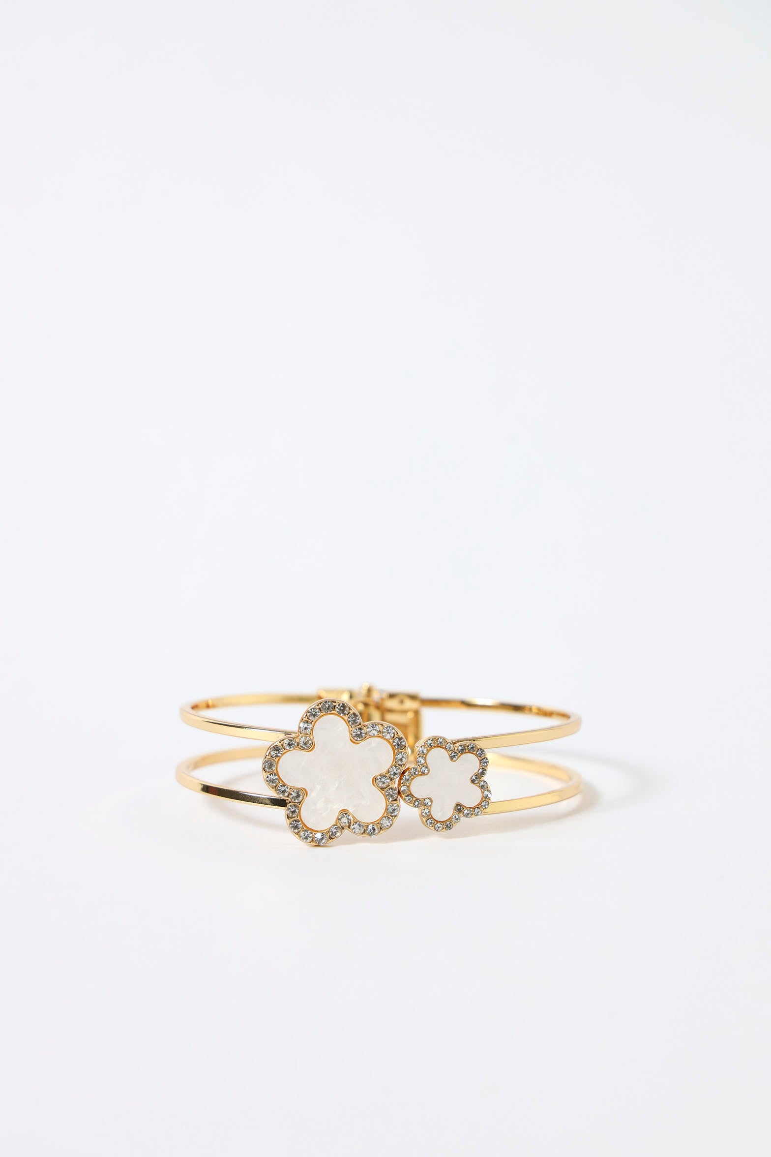 Sparkle and shine with our Diamante Flower Bangle in radiant gold. This eye-catching accessory features a stunning flower design adorned with glittering diamante stones that catch the light beautifully. Perfect for adding instant glamour to any outfit, from casual daywear to special occasion looks. The smooth bangle design slips on effortlessly and sits comfortably on your wrist all day long. Whether you're dressing up or keeping it simple, this bangle is your go-to sparkle boost!