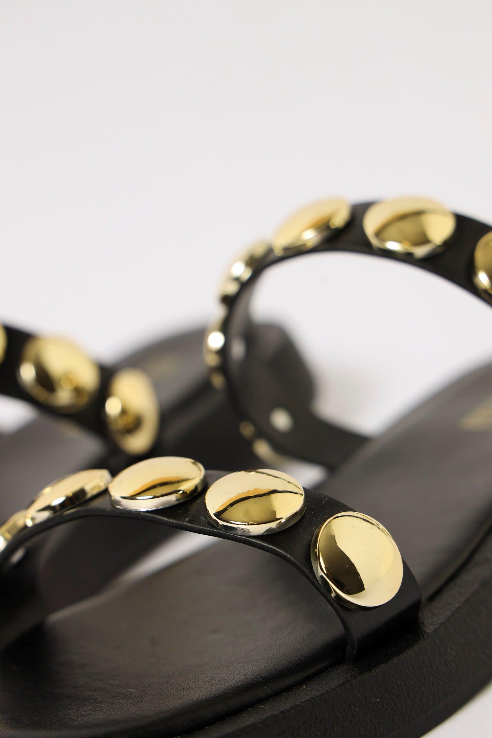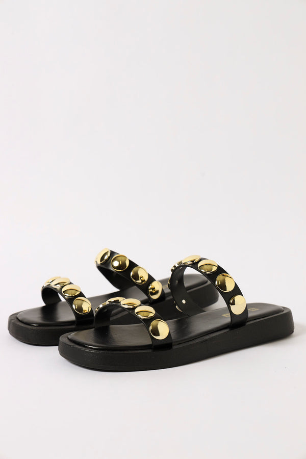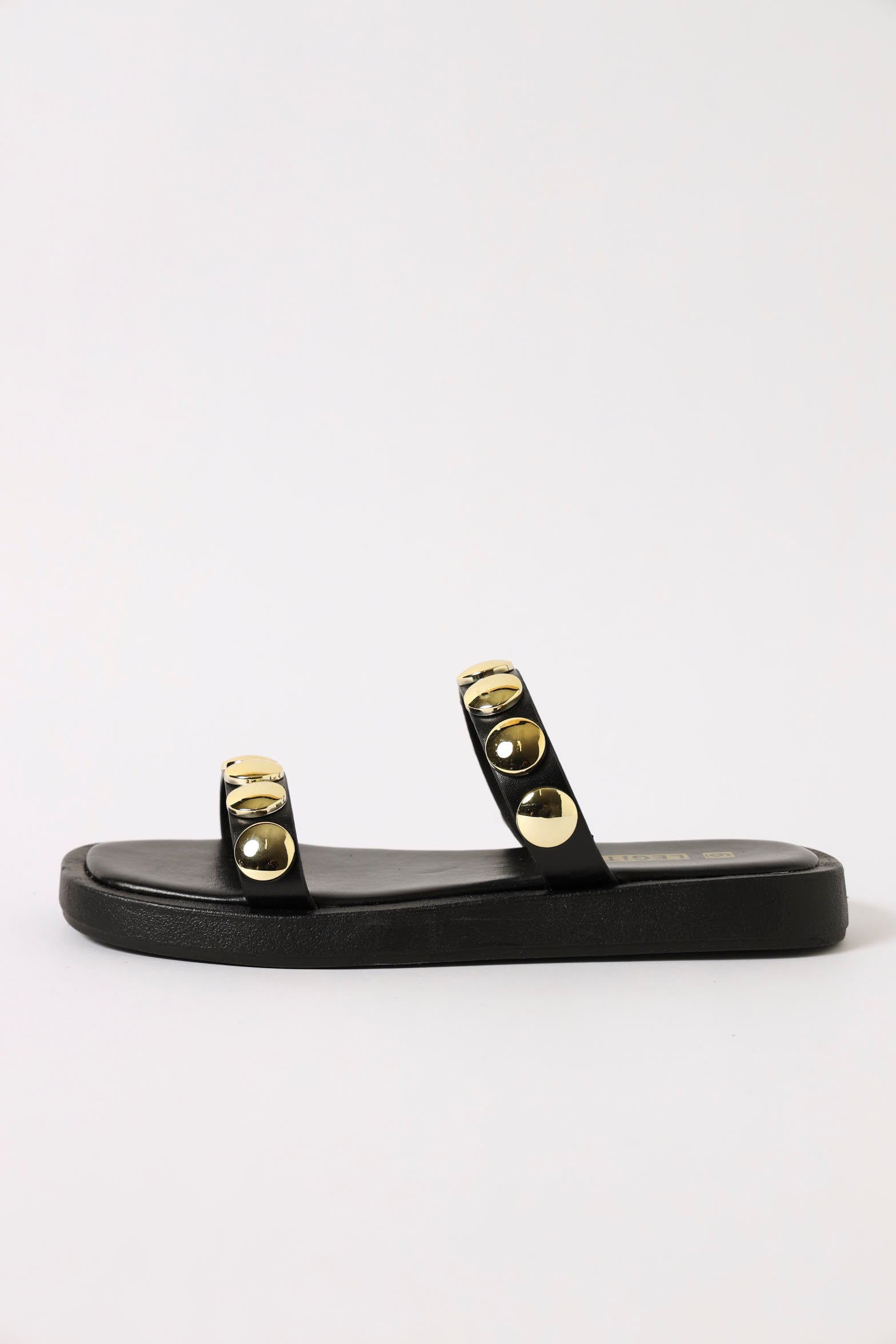 Turn heads with this fearless sandal that combines double strap security with oversized stud embellishments in classic black. The prominent studs give serious edge and personality, while the dual straps keep your foot locked in place all day long. Perfect for those who refuse to blend in, this shoe transforms any outfit into a bold fashion statement. Comfort meets attitude in one killer design.